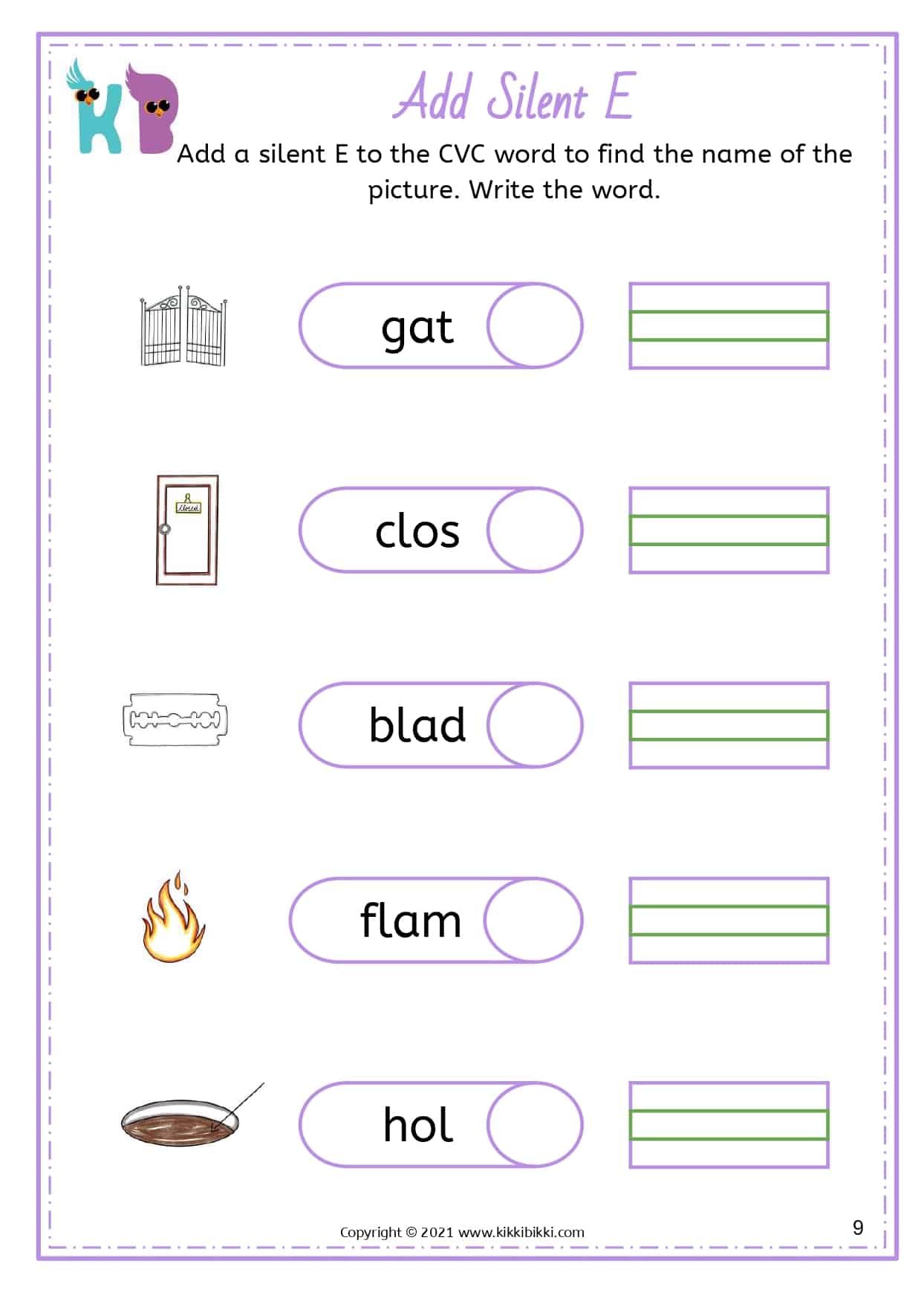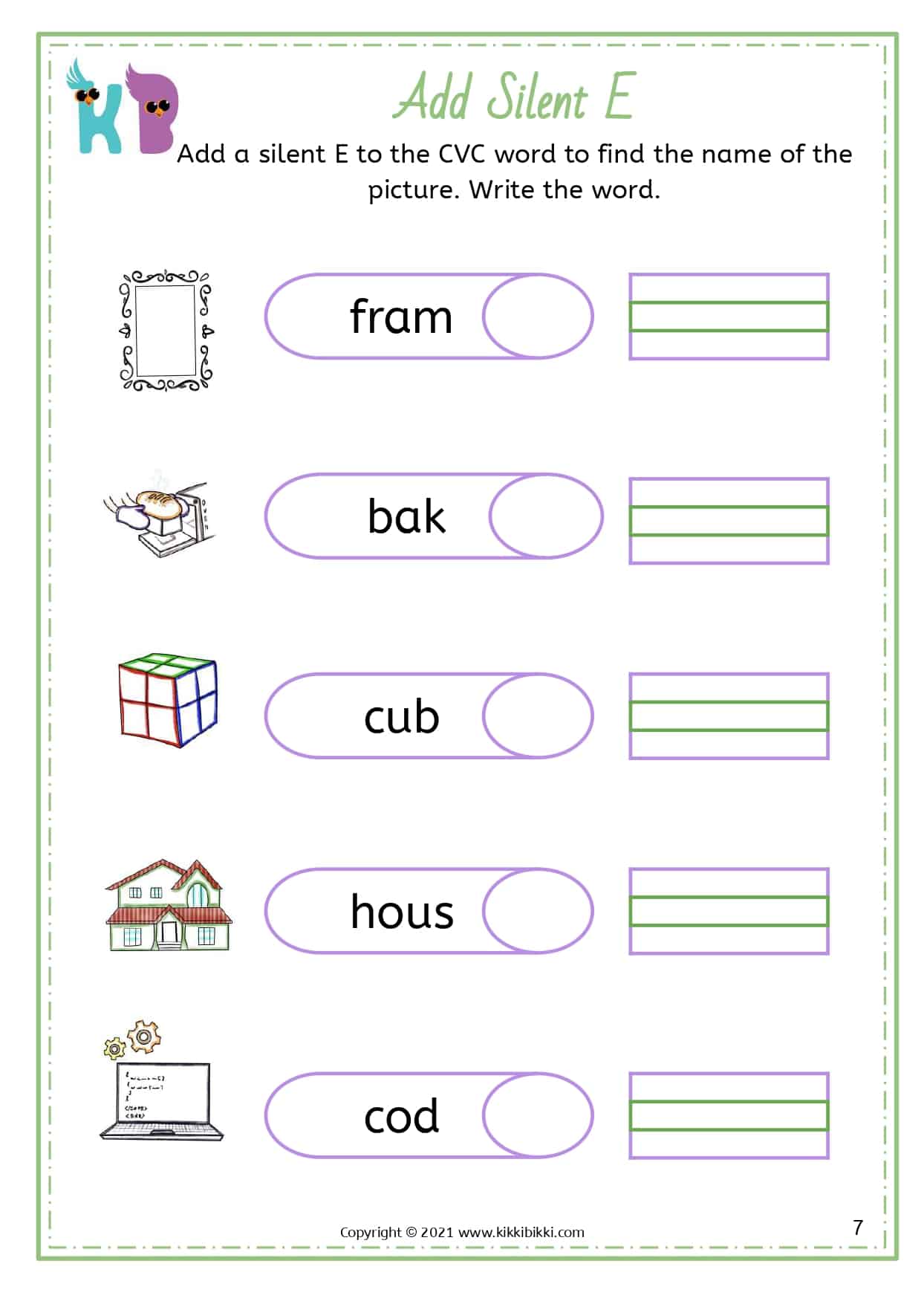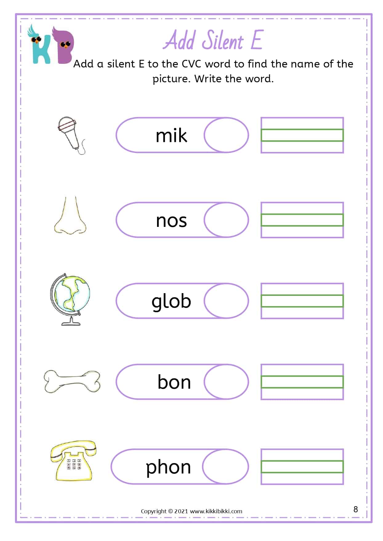 Welcome to KikkiBikki where learning meets fun We are excited to introduce our latest addition to our collection of free printable worksheets. CVC to CVCe Words. In this blog post, we’ll explore the fascinating world of phonics and how these worksheets can help children transition from simple CVC (consonant vowel consonant) words to more complex CVCe (consonant vowel consonant silent e) words.