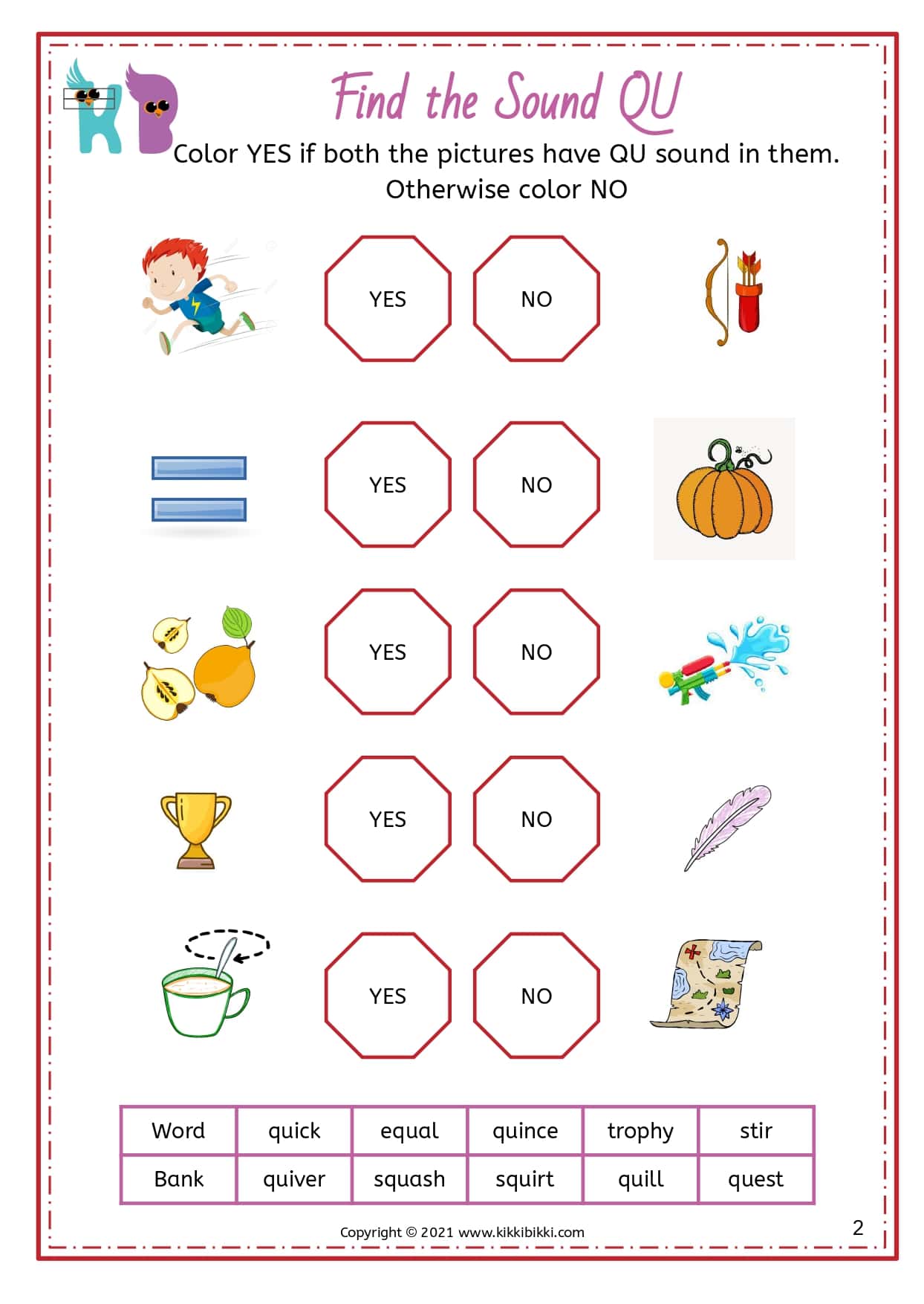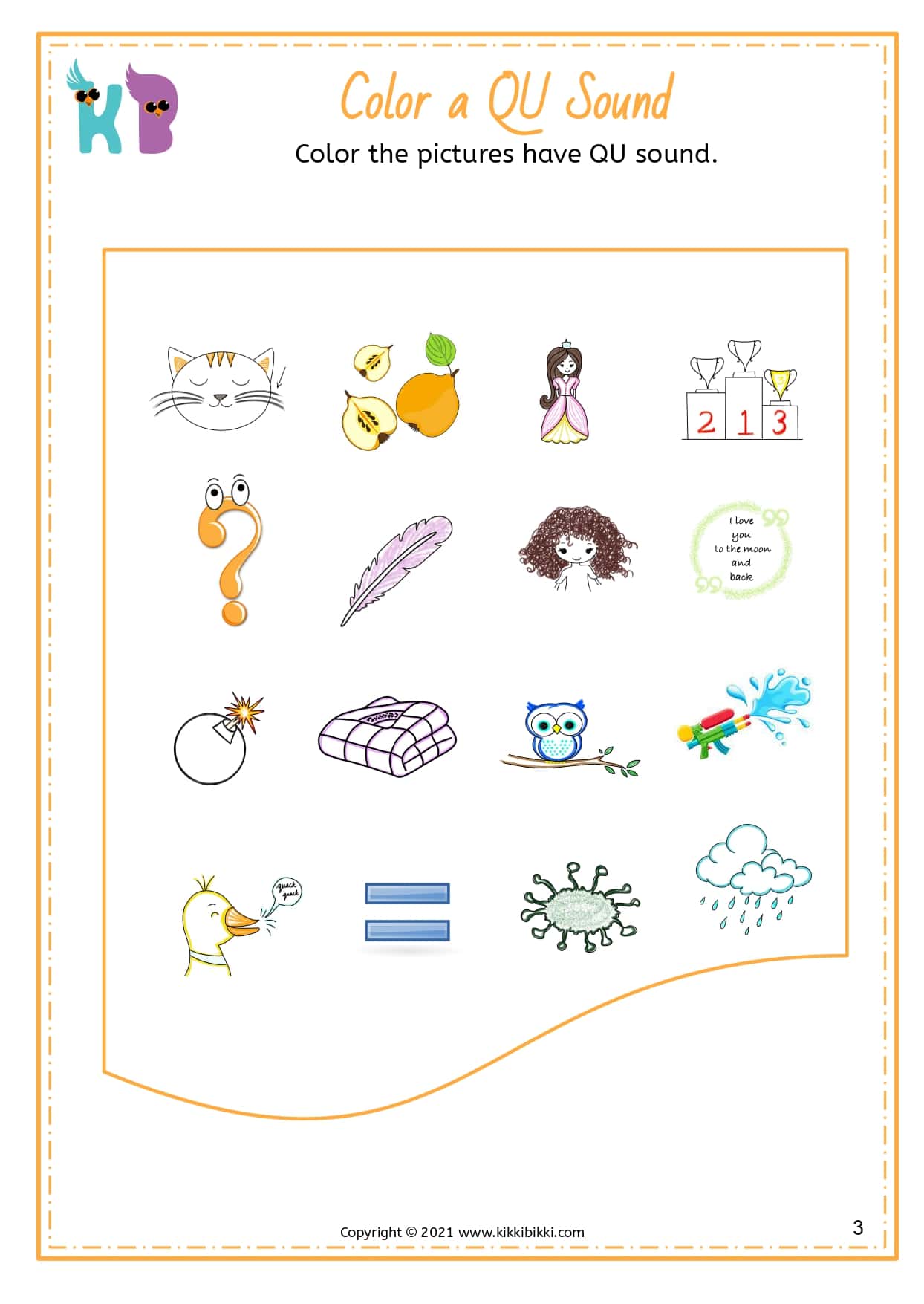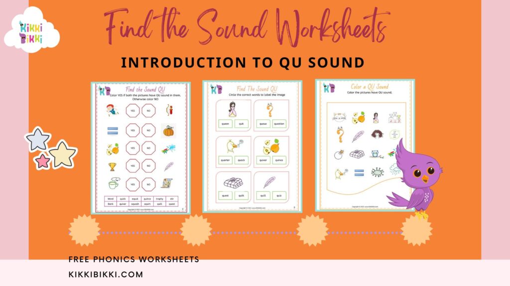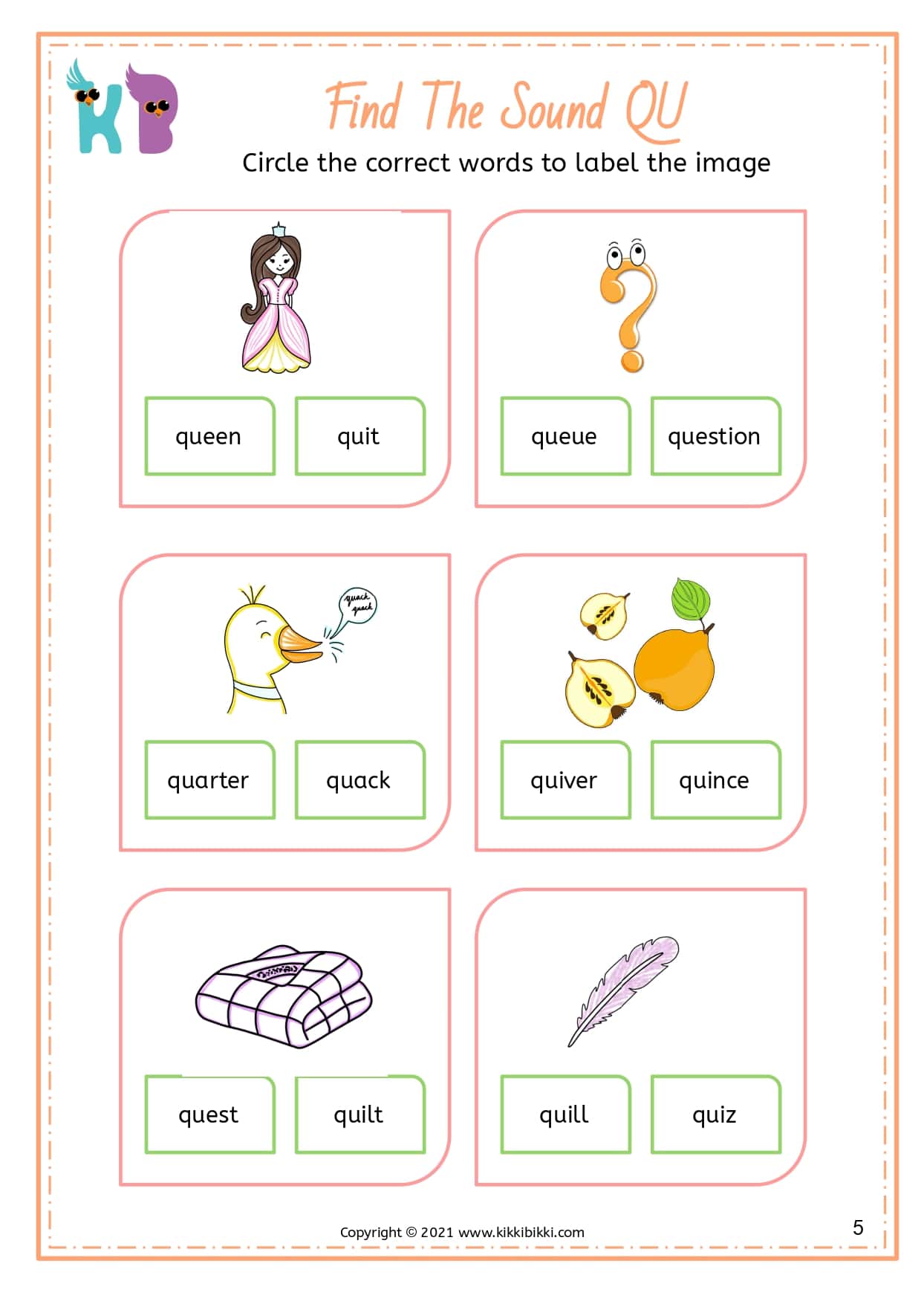 Welcome to KikkiBikki’s phonics playground, where learning to read is an exciting adventure! Today, we’re diving into the world of consonant digraphs, focusing specifically on the “QU” sound. Consonant digraphs are pairs of letters that work together to create a unique sound, and the “QU” combination is a perfect example. In our introductory worksheets, children will embark on a journey to find words containing the “QU” sound. From “queen” to “quack,” these exercises provide an interactive way for children to familiarize themselves with words featuring this special digraph. Our free printable worksheets offer a hands on approach to phonics learning, making it easy and enjoyable for children to explore the fascinating world of consonant digraphs. Let’s begin our quest to uncover the magic of the “QU” sound together!