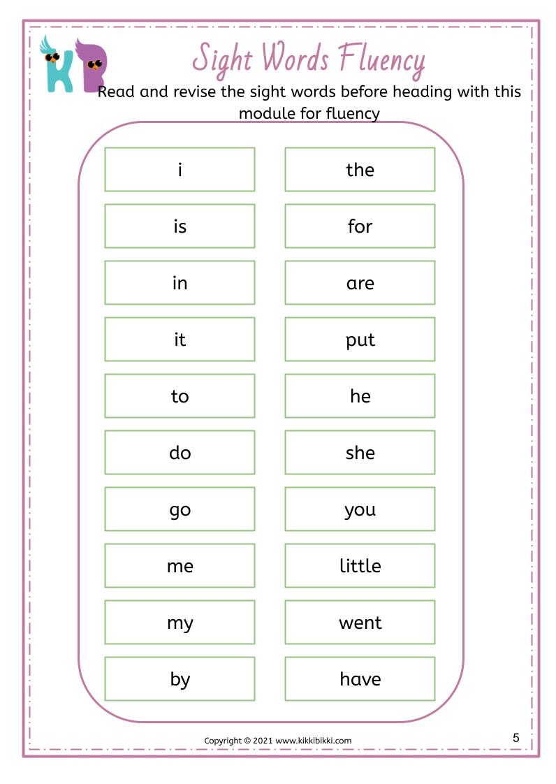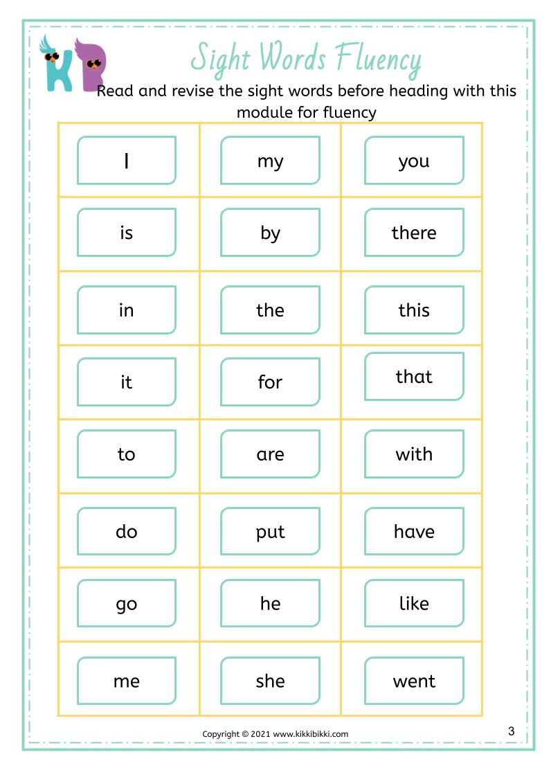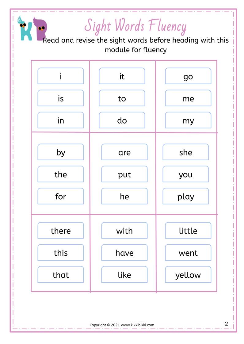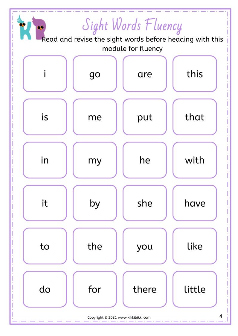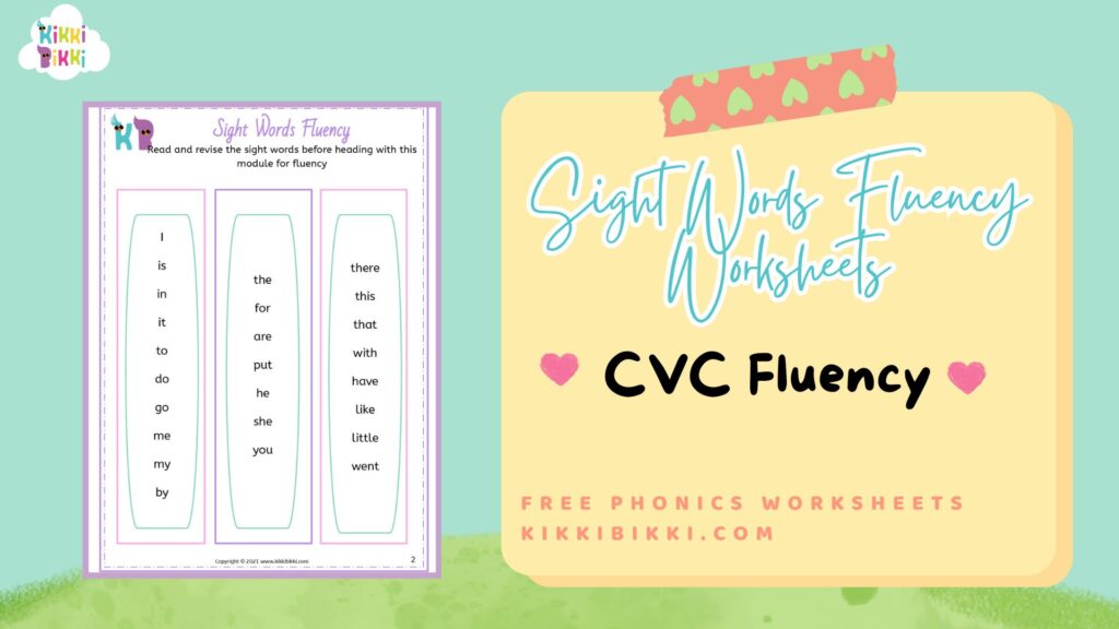 Welcome to KikkiBikki, where learning meets fun! Our latest series of phonics worksheets is designed to help children master CVC (Consonant Vowel Consonant) word fluency and sight word recognition. CVC words are simple three letter words that follow a consonant vowel consonant pattern, making them an essential building block for early reading skills. In this set of sight word fluency worksheets, children will embark on an interactive journey to enhance their reading proficiency.