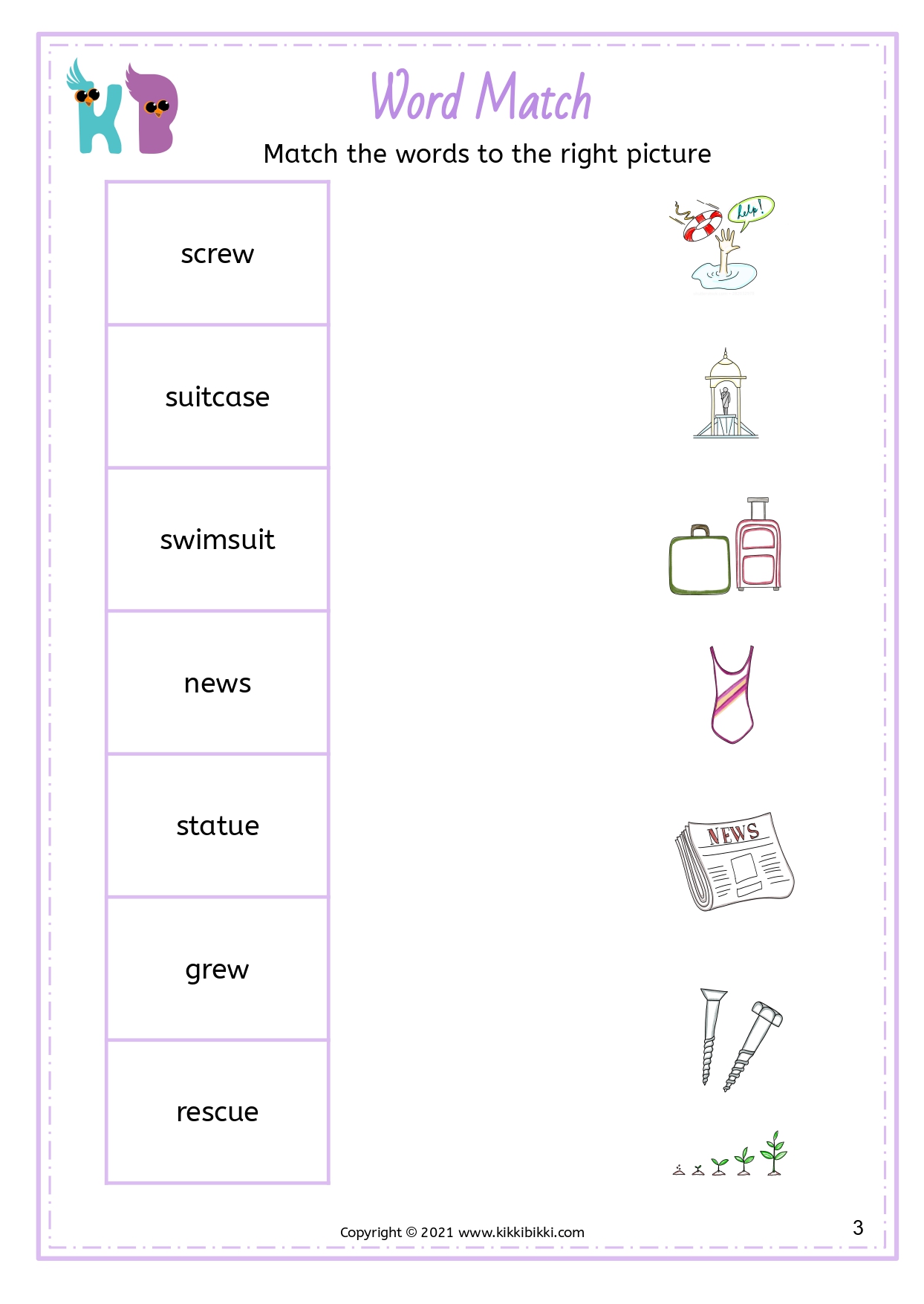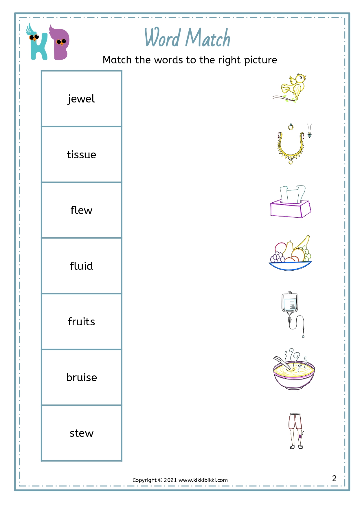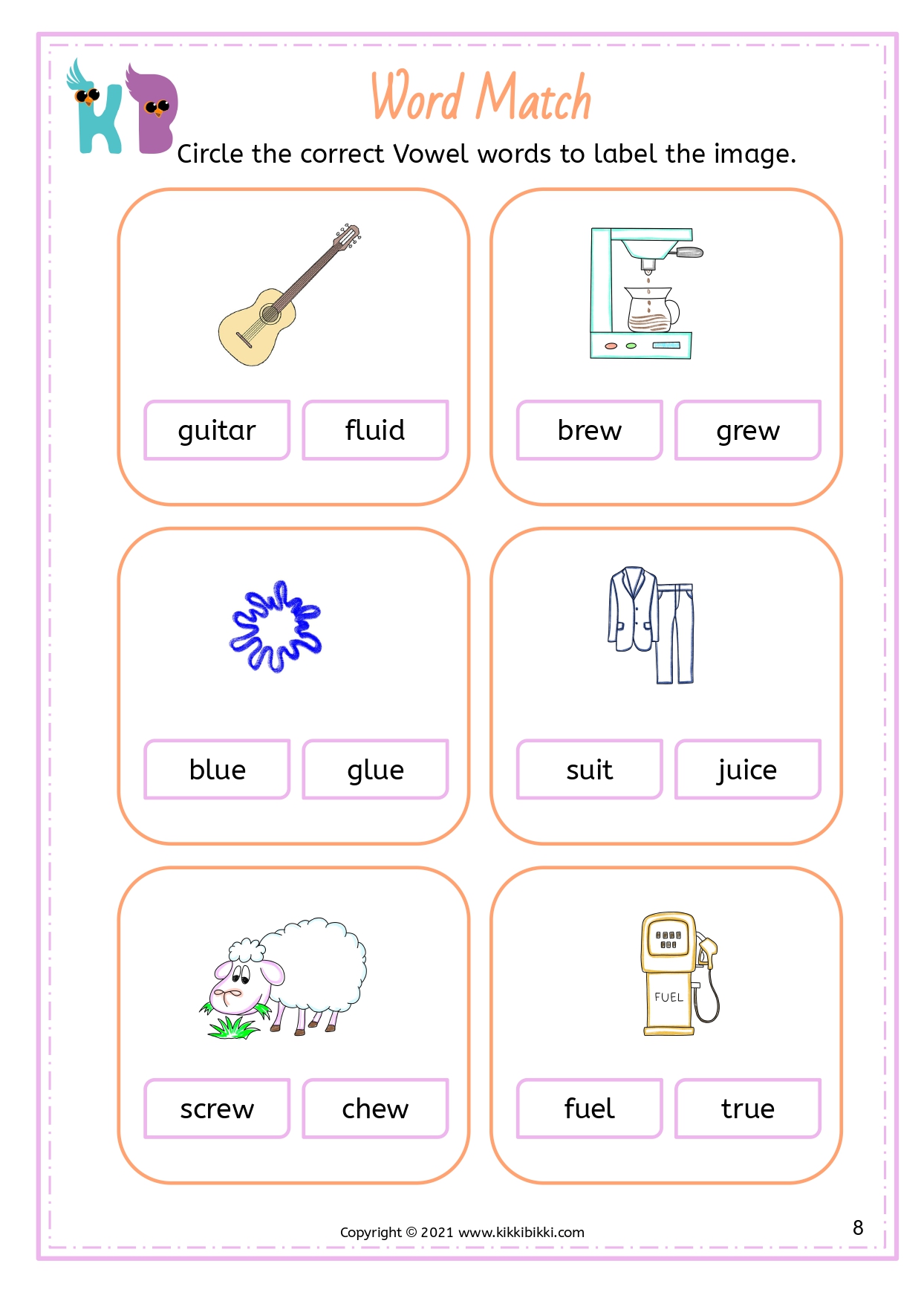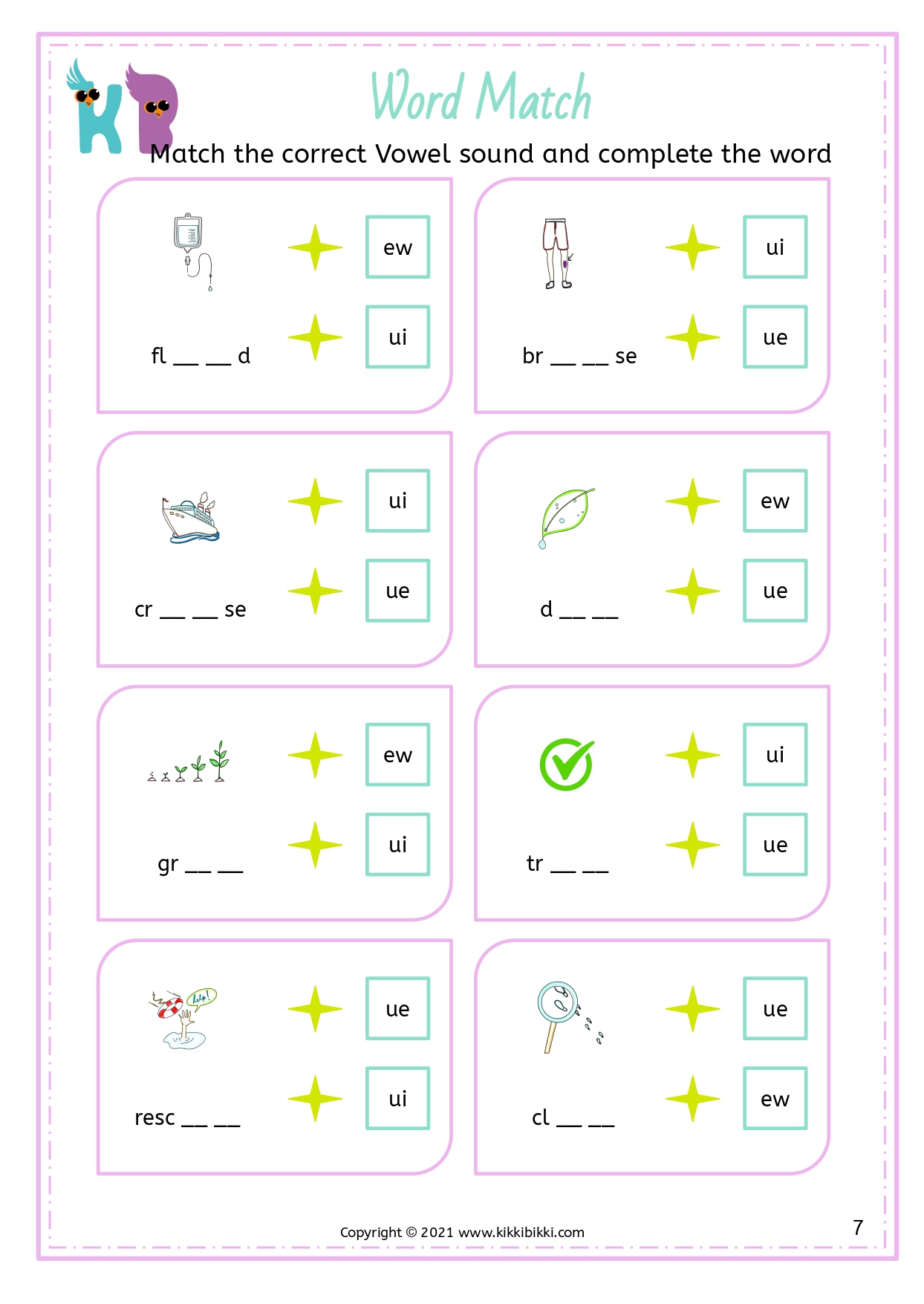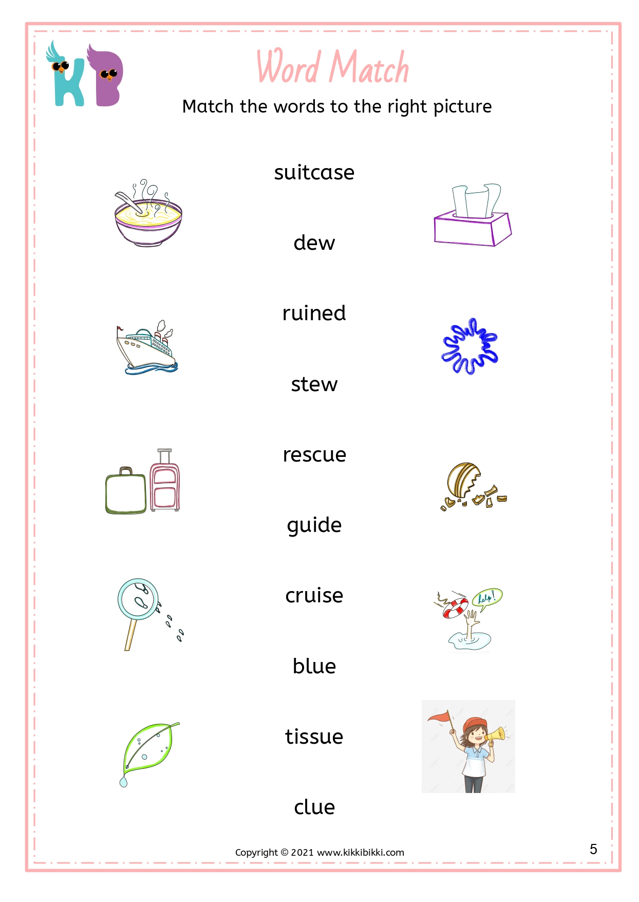 Word match worksheets provide a fun and interactive way for children to reinforce their understanding of the EW, UE, and UI sounds.