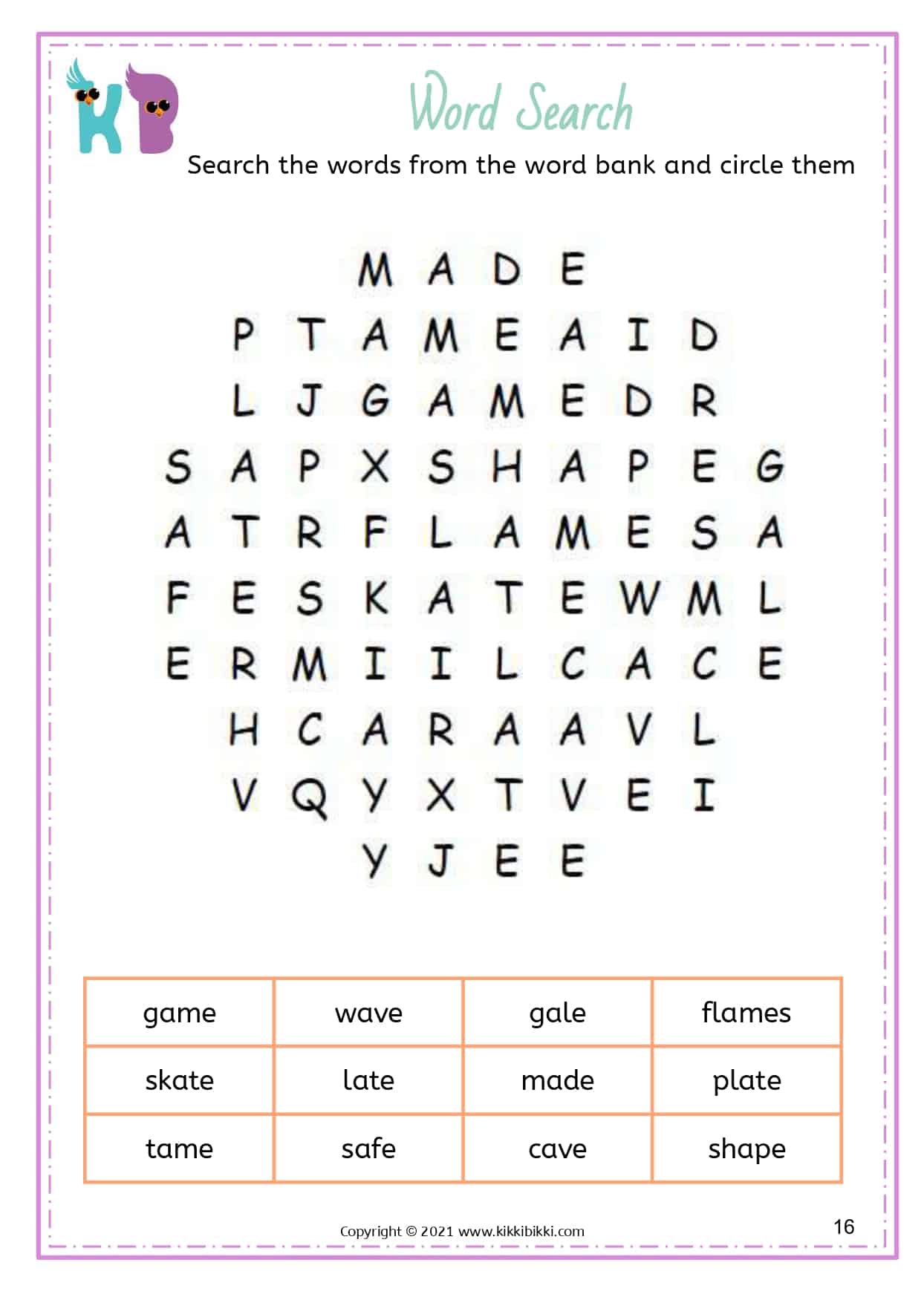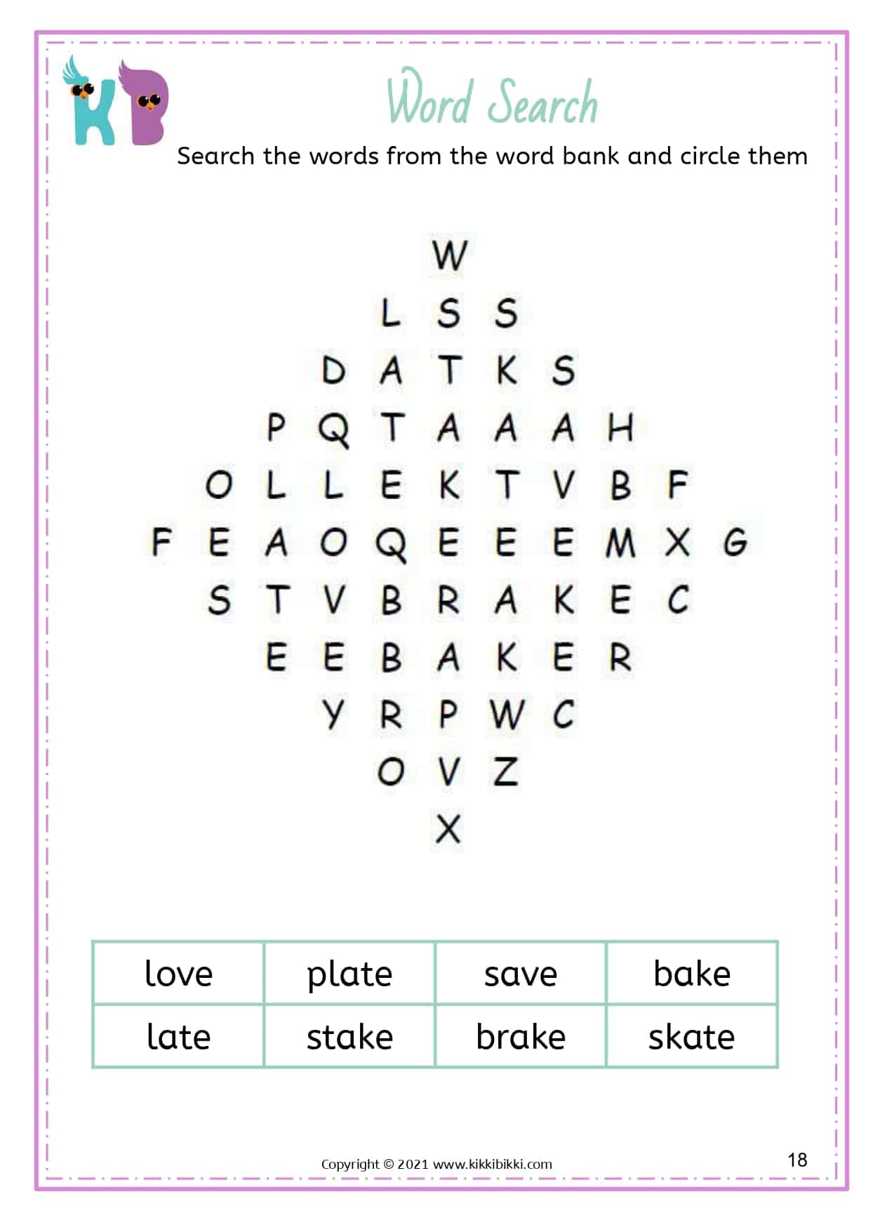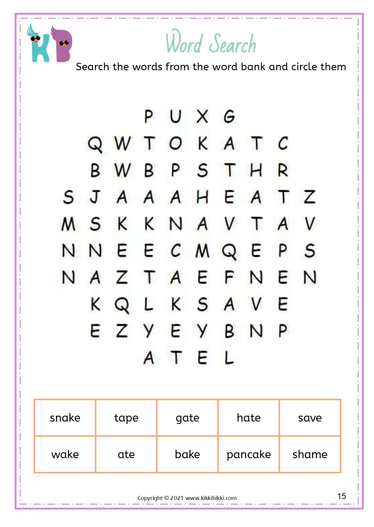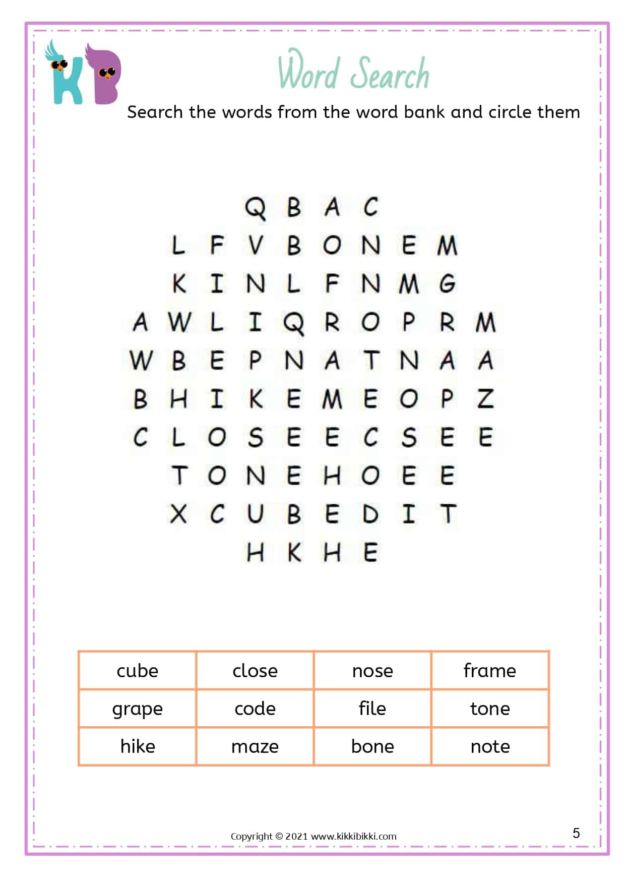Our free printable word search worksheets with silent E specifically focus on reinforcing long vowel sounds. These worksheets are designed to assist kindergarteners in strengthening their understanding and application of this important phonetic principle. Each word search puzzle contains a selection of words featuring the silent E pattern, allowing students to actively search for and identify words with long vowel sounds created by the silent E. By engaging in these enjoyable word search exercises, young learners gain proficiency in differentiating between short and long vowel sounds, resulting in improved reading fluency. These interactive and engaging activities offer an entertaining way for students to reinforce their phonics skills while expanding their silent E word recognition abilities. Start printing our free printable word search worksheets today and discover the magic of silent E in developing reading fluency.