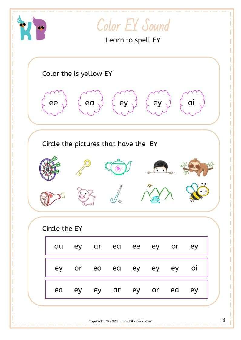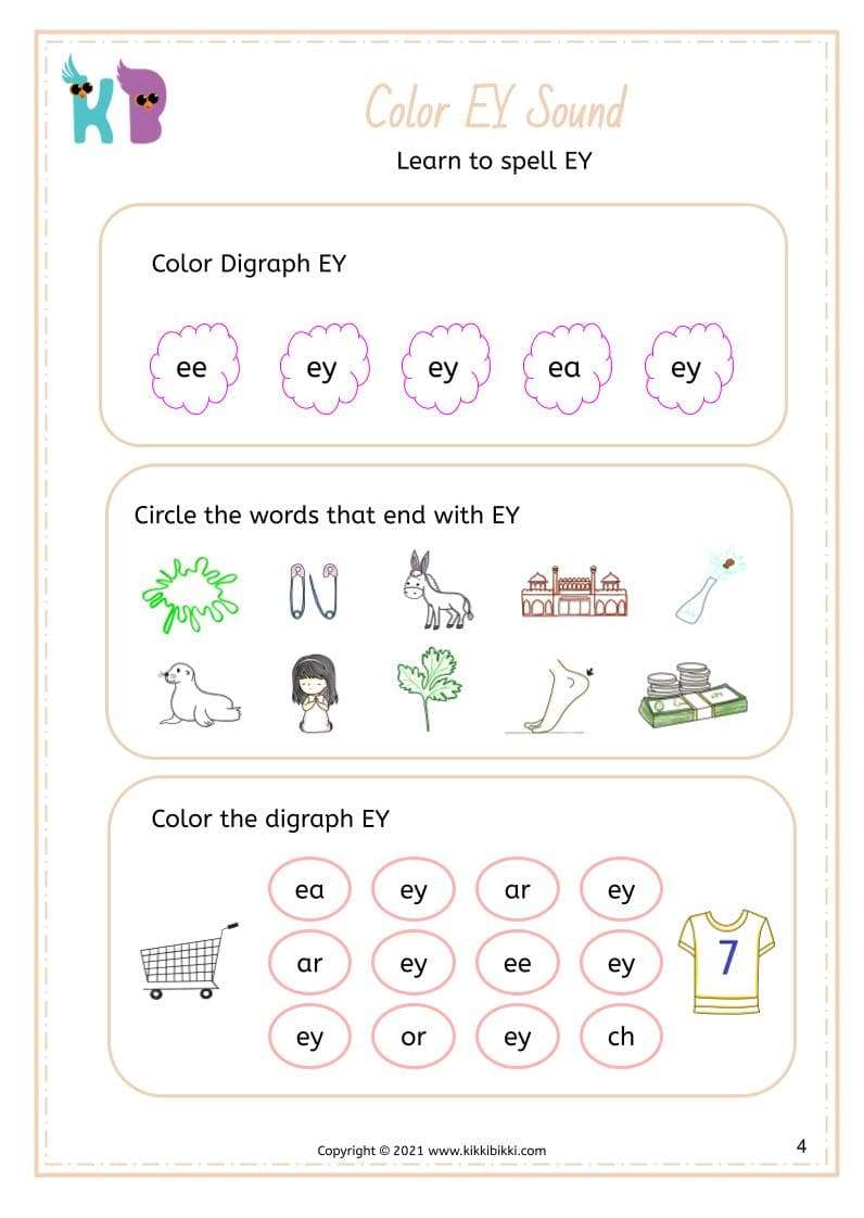 Welcome to KikkiBikki’s phonics playground, where learning is always an adventure! Today, we’re delving into the fascinating world of vowel digraphs with a focus on the EY sound. Vowel digraphs are pairs of vowels that work together to create a unique sound, and mastering them is a crucial step in developing strong reading skills. In these interactive worksheets, children will have the opportunity to match pictures with words containing the EY sound. From “key” to “monkey,” young learners will practice associating the visual representation of objects with their corresponding phonetic sounds. Our free printable worksheets offer a fun and engaging way for kids to strengthen their phonics knowledge while enhancing their vocabulary and visual recognition skills.