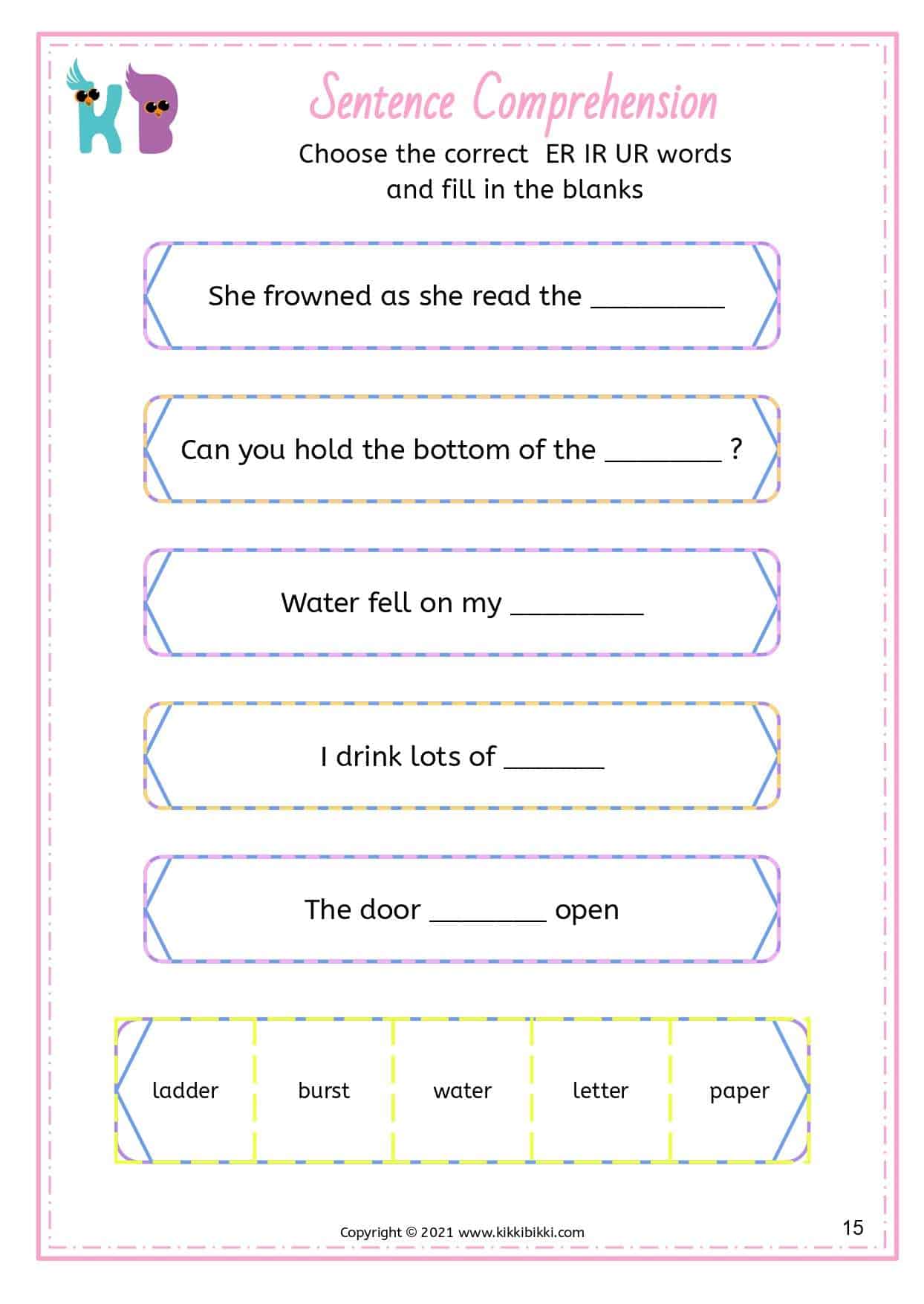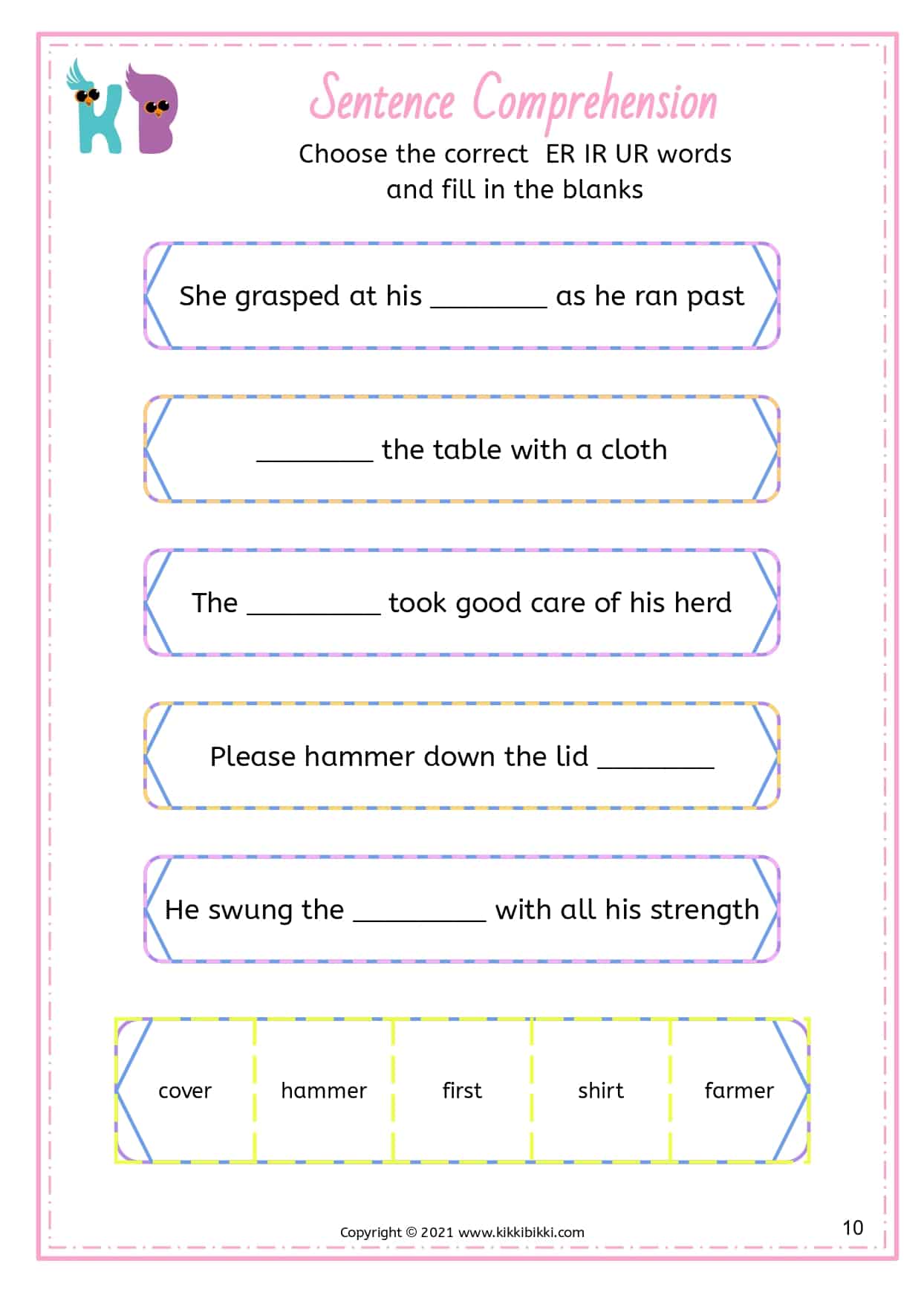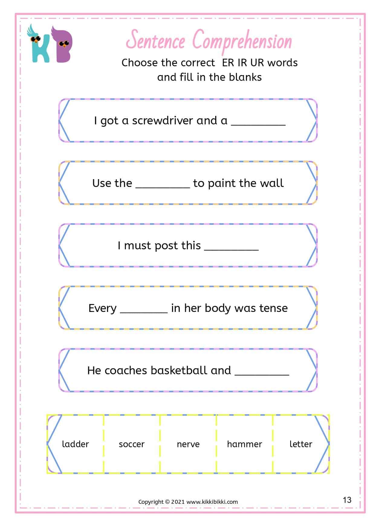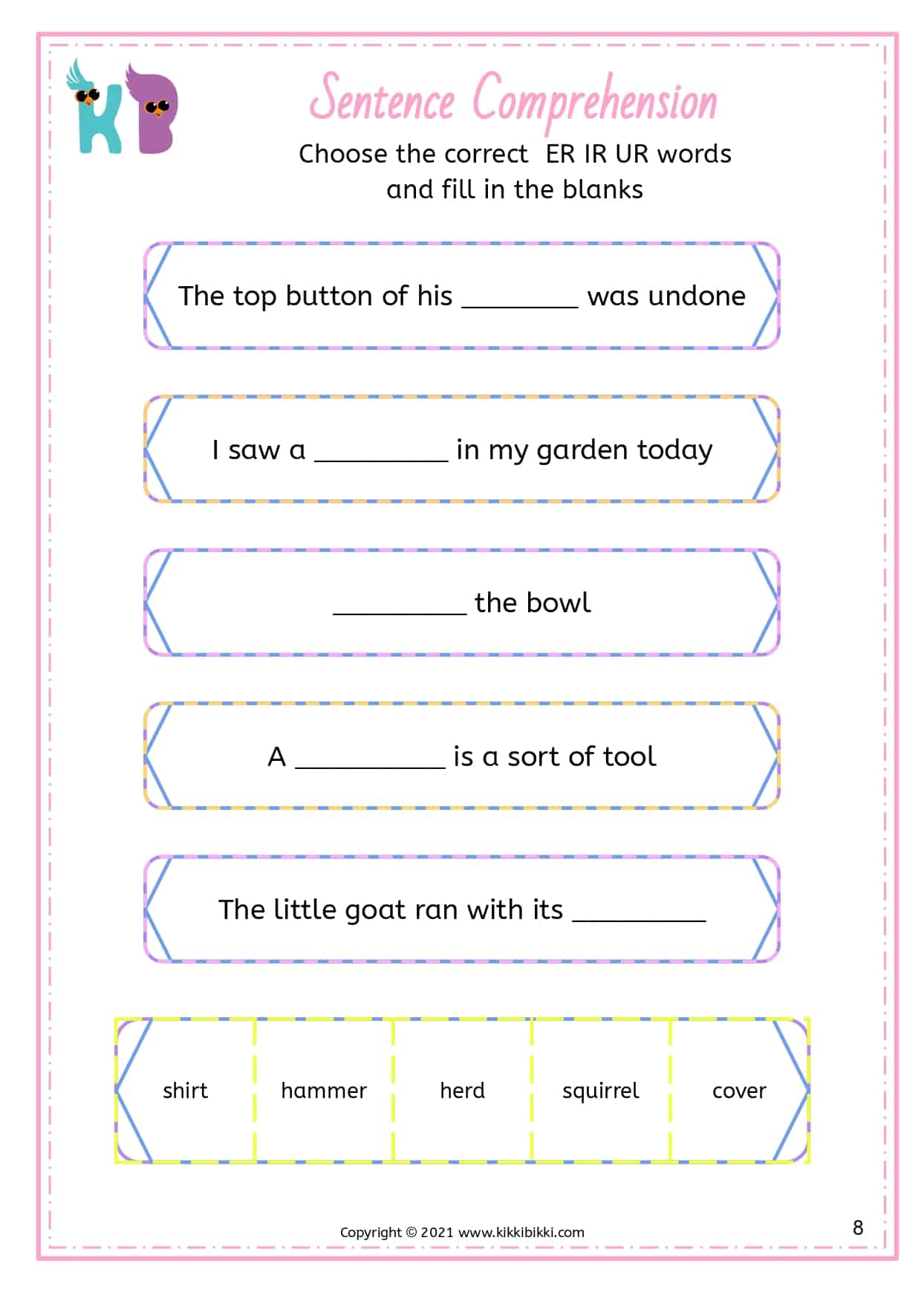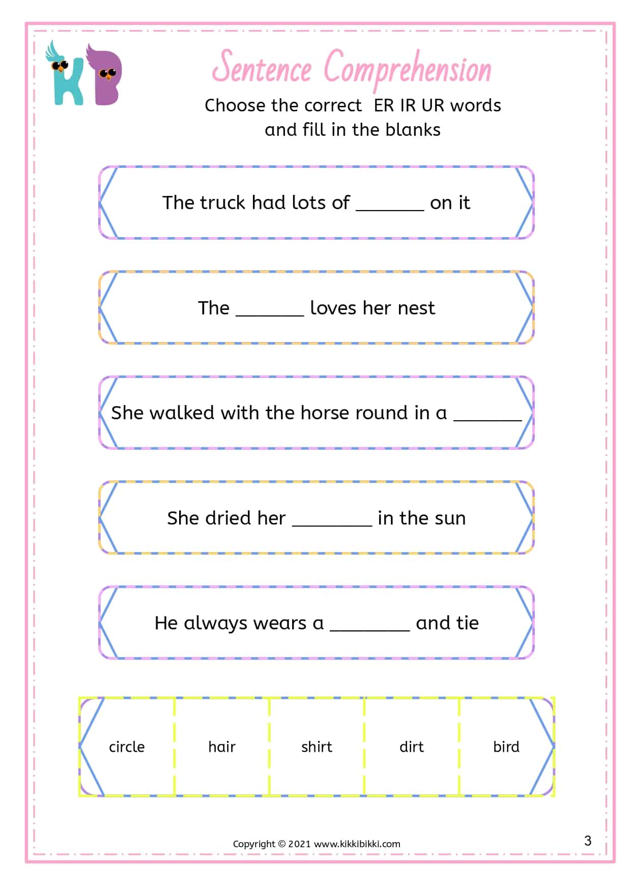 Bossy R : Sentence Comprehension Worksheets for IR ER and UR Words
