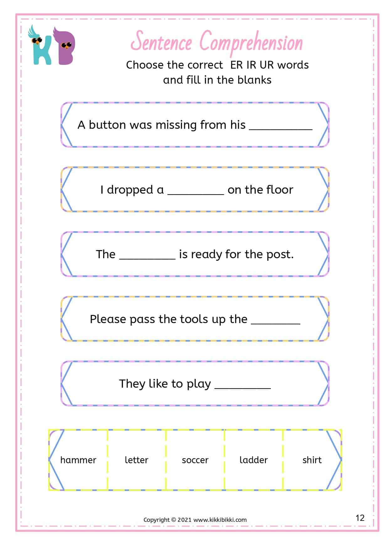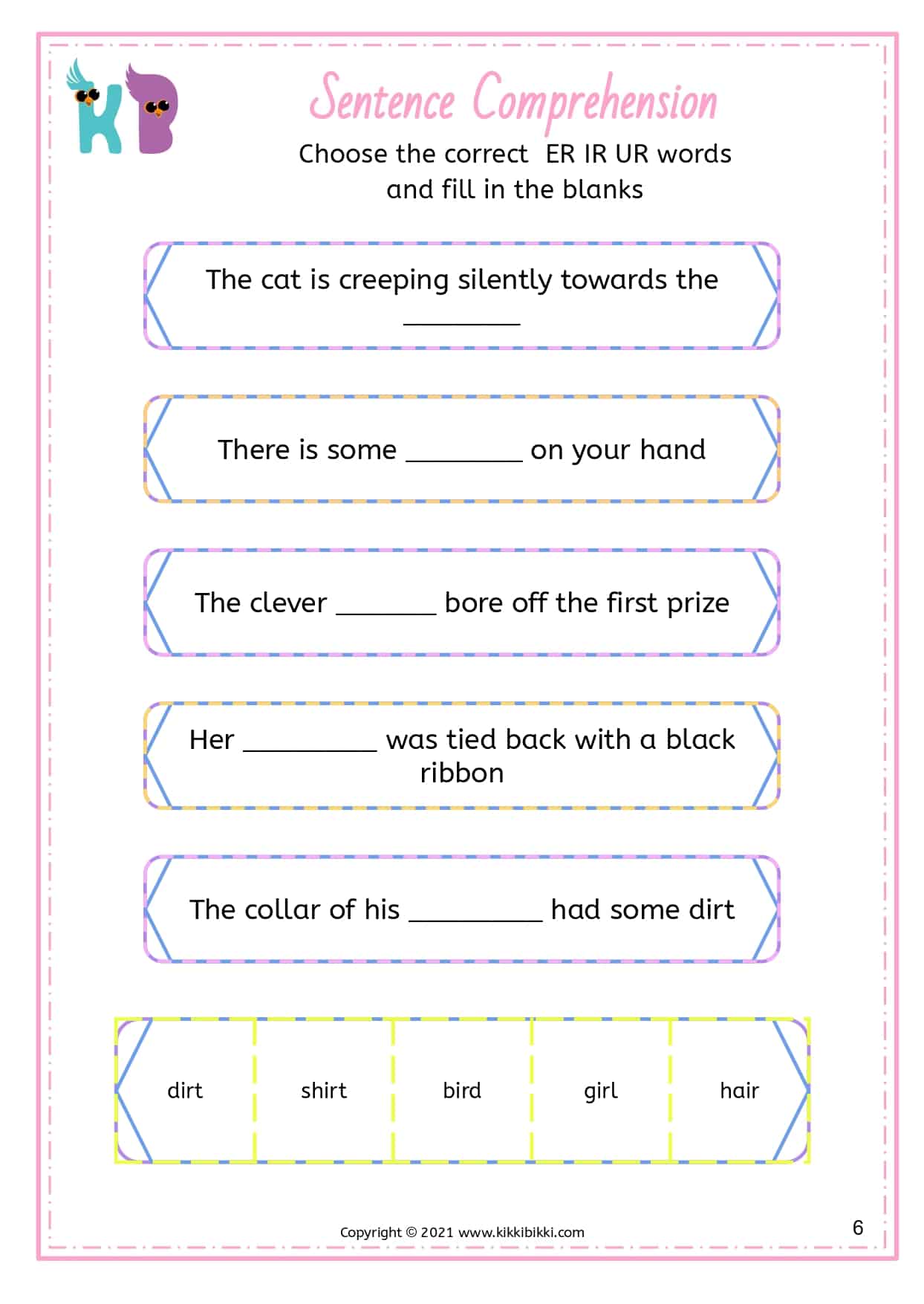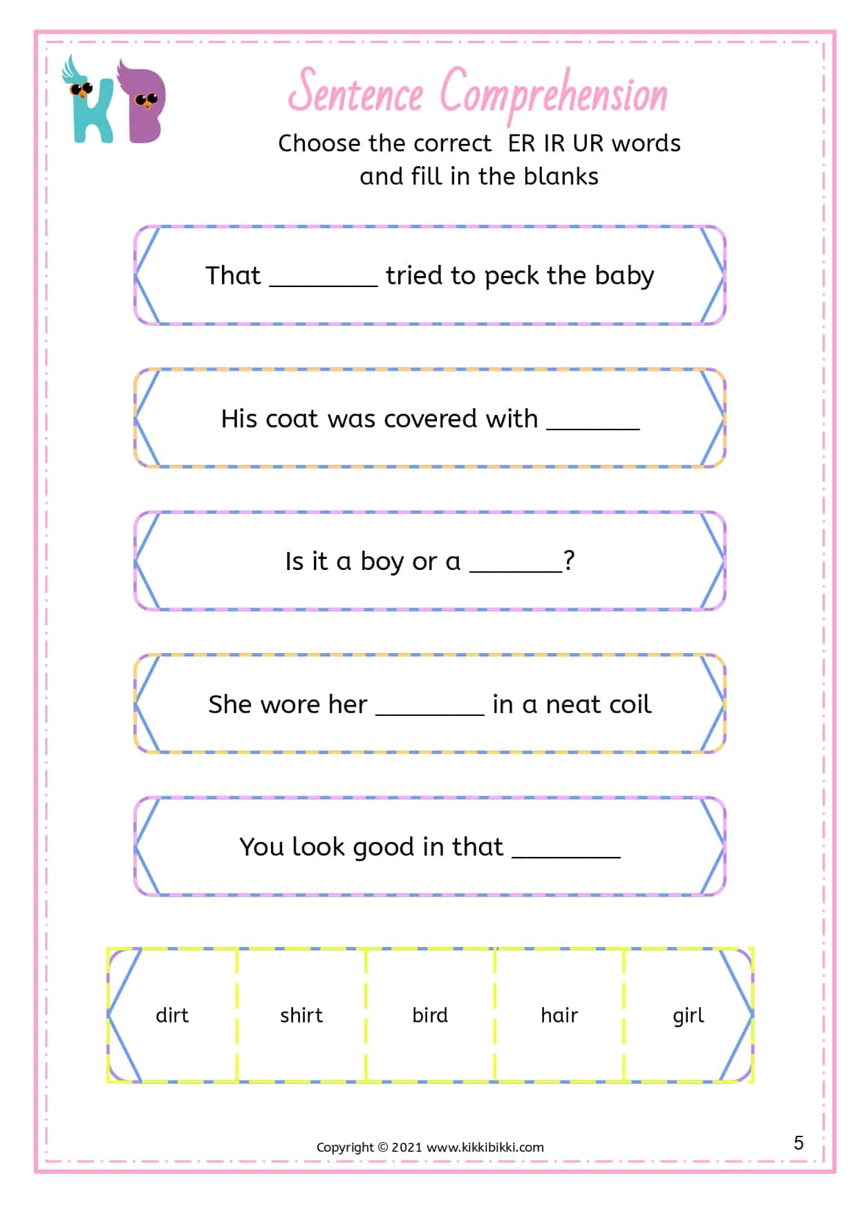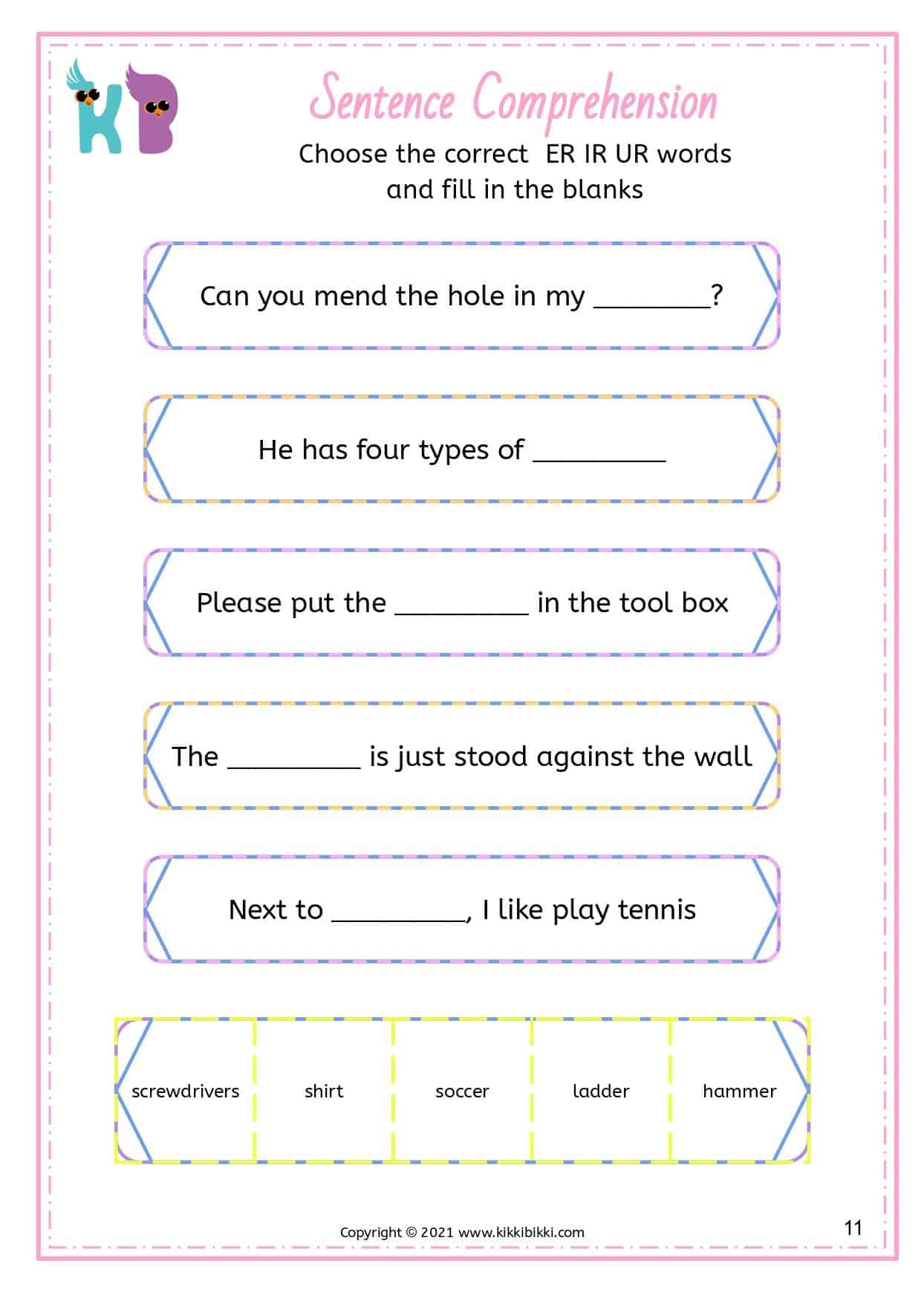 Bossy R : Sentence Comprehension Worksheets for IR ER and UR Words