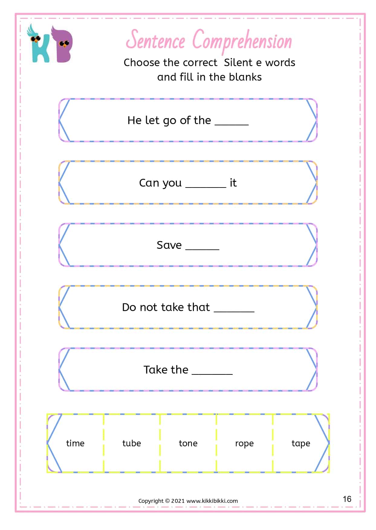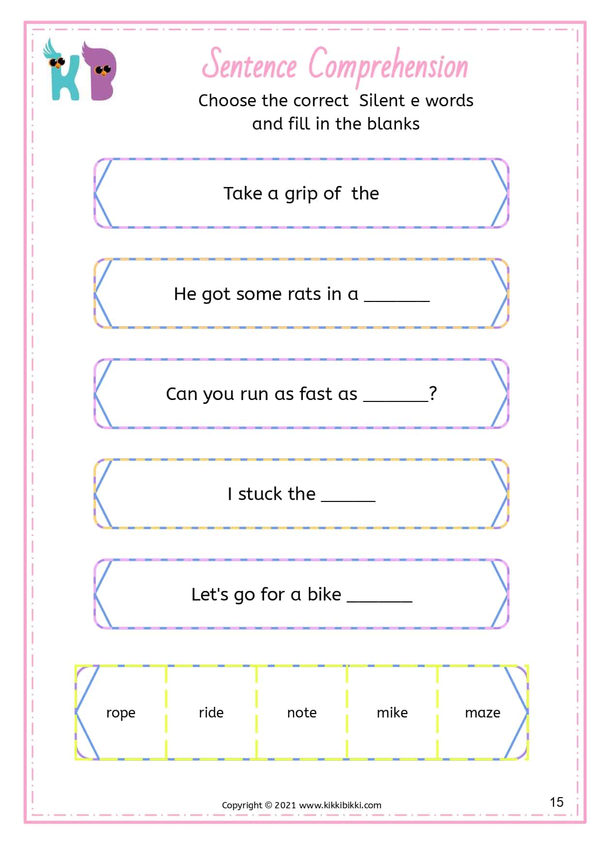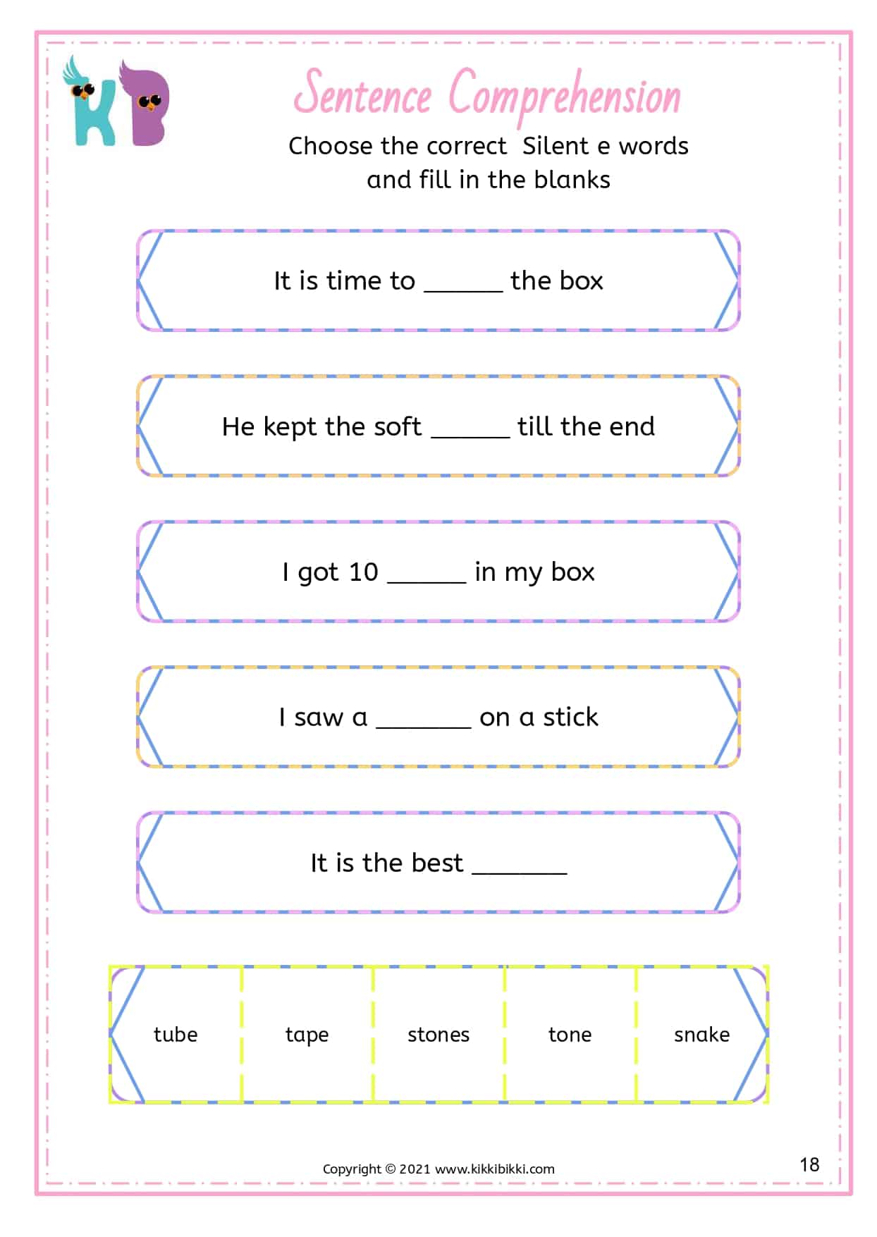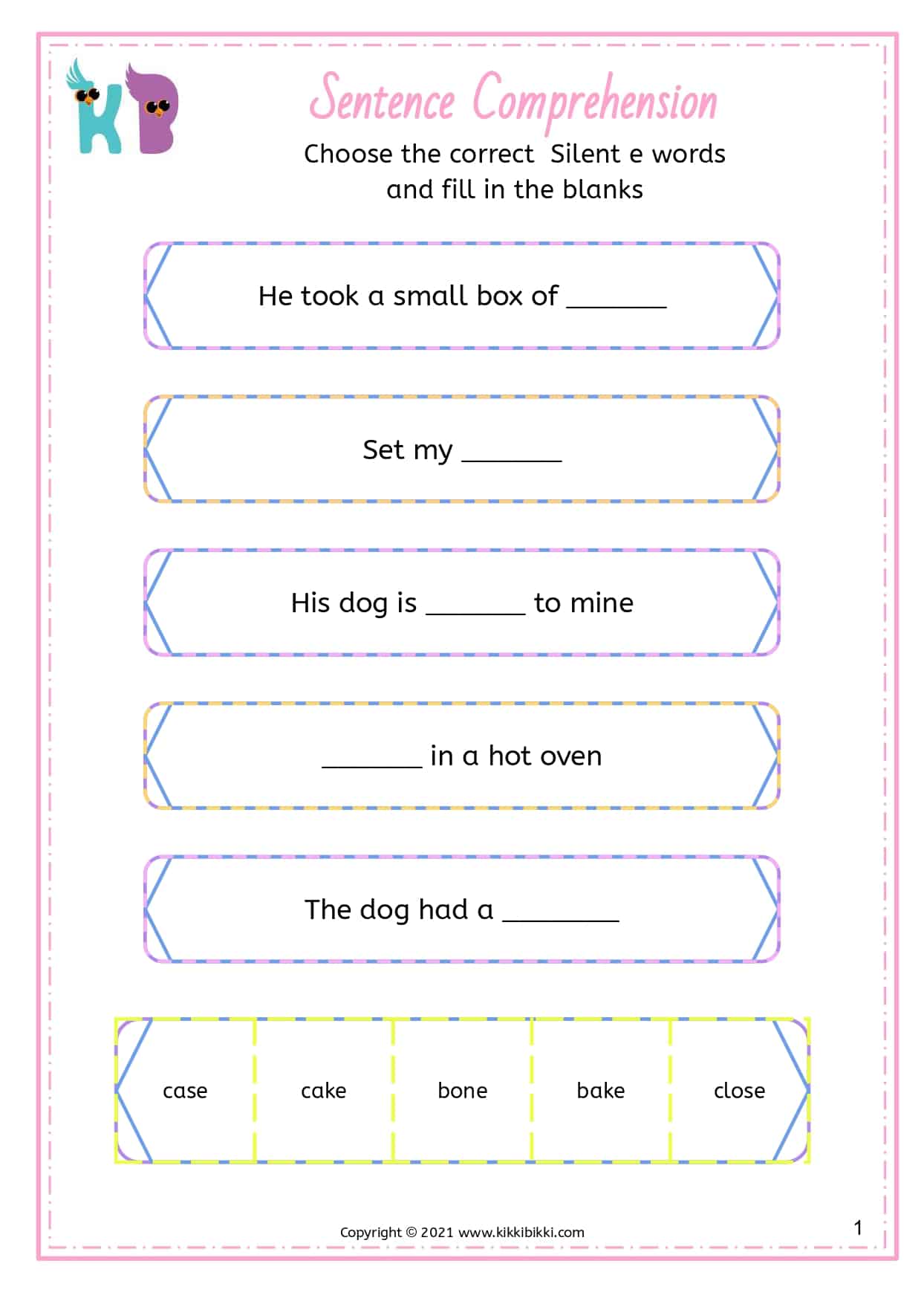 Unlocking the world of silent E words is an essential step in developing reading fluency and vocabulary skills for kindergarteners. Our free simple comprehension worksheets offer an exciting opportunity to reinforce silent E word recognition, comprehension, and vocabulary expansion. By engaging in these activities, children build the foundation they need to become confident readers with a strong command of silent E words. Embrace the magic of silent E and watch your child's reading abilities flourish!