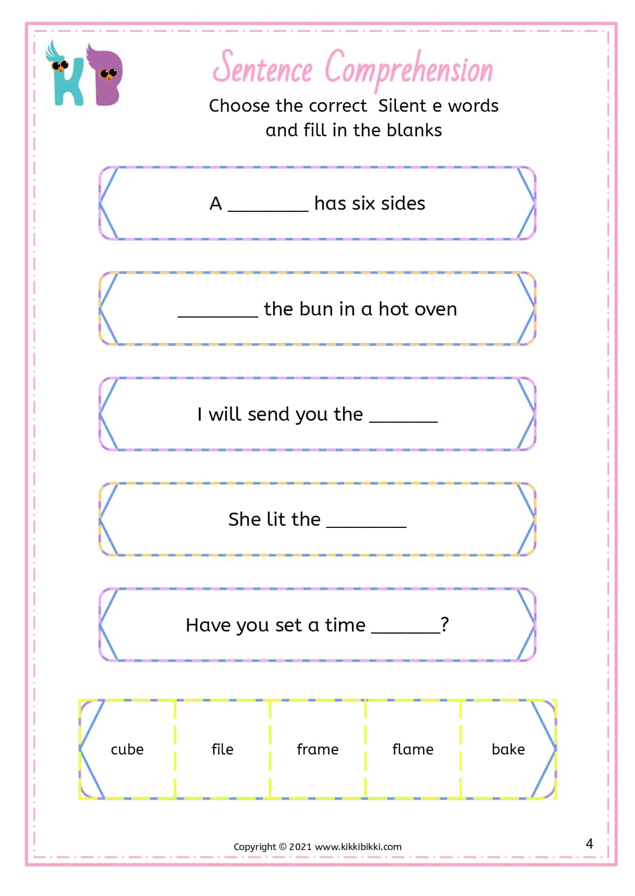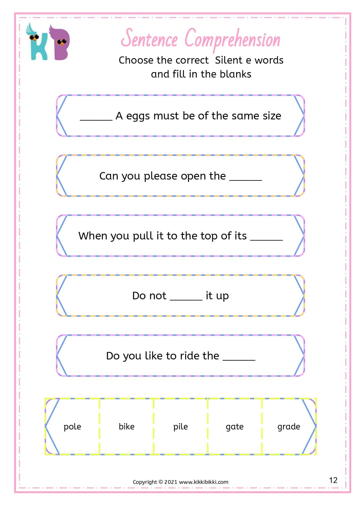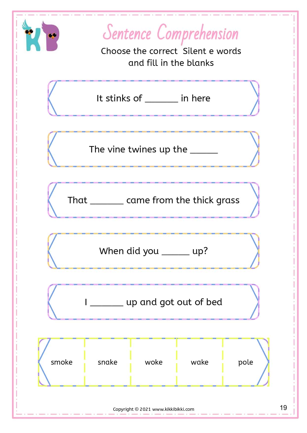 Unlocking the world of silent E words is an essential step in developing reading fluency and vocabulary skills for kindergarteners. Our free simple comprehension worksheets offer an exciting opportunity to reinforce silent E word recognition, comprehension, and vocabulary expansion. By engaging in these activities, children build the foundation they need to become confident readers with a strong command of silent E words. Embrace the magic of silent E and watch your child's reading abilities flourish!
