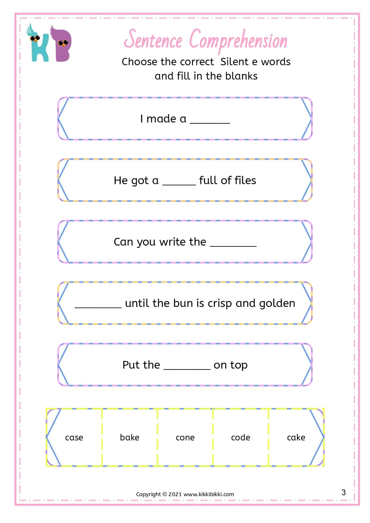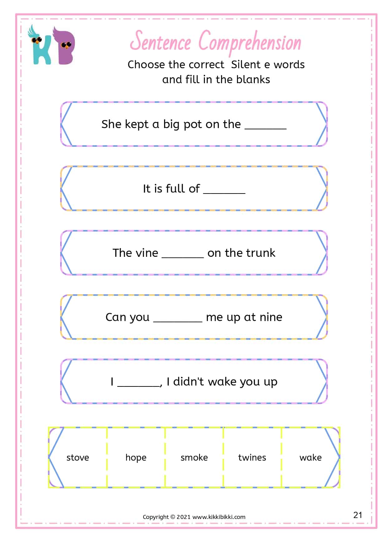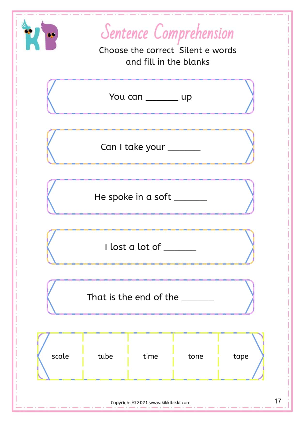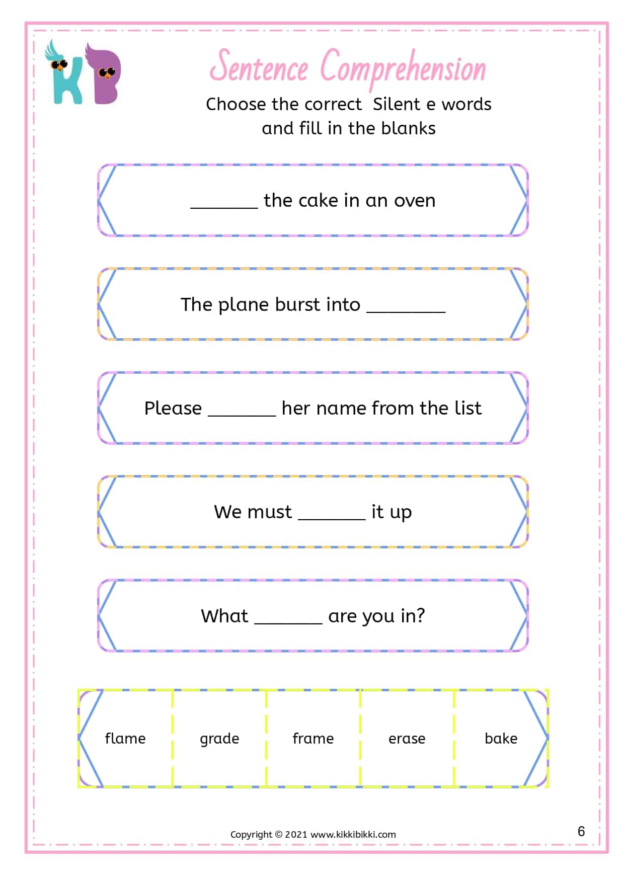 Unlocking the world of silent E words is an essential step in developing reading fluency and vocabulary skills for kindergarteners. Our free simple comprehension worksheets offer an exciting opportunity to reinforce silent E word recognition, comprehension, and vocabulary expansion. By engaging in these activities, children build the foundation they need to become confident readers with a strong command of silent E words. Embrace the magic of silent E and watch your child's reading abilities flourish!