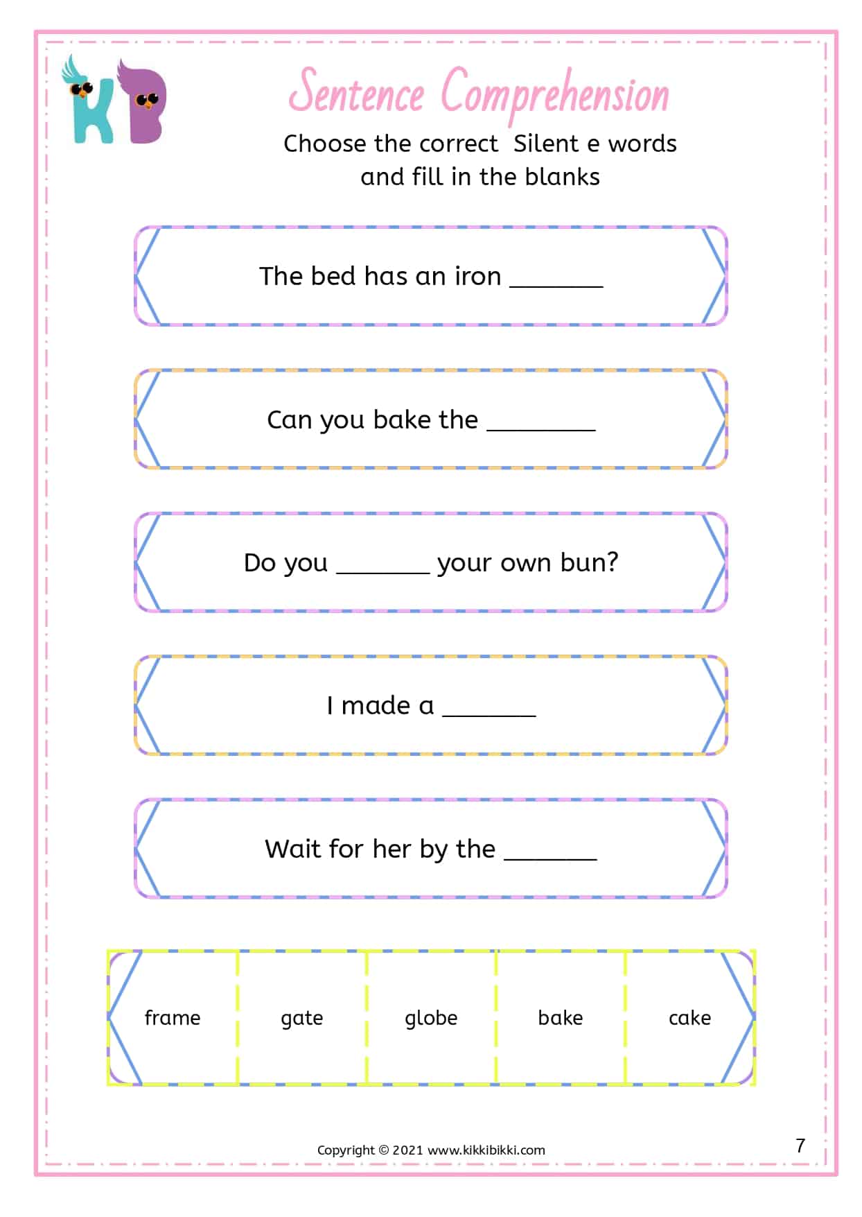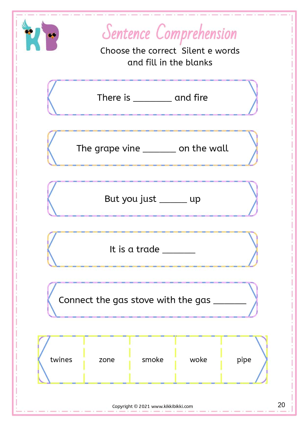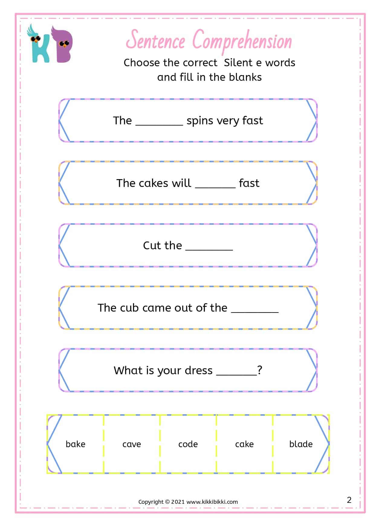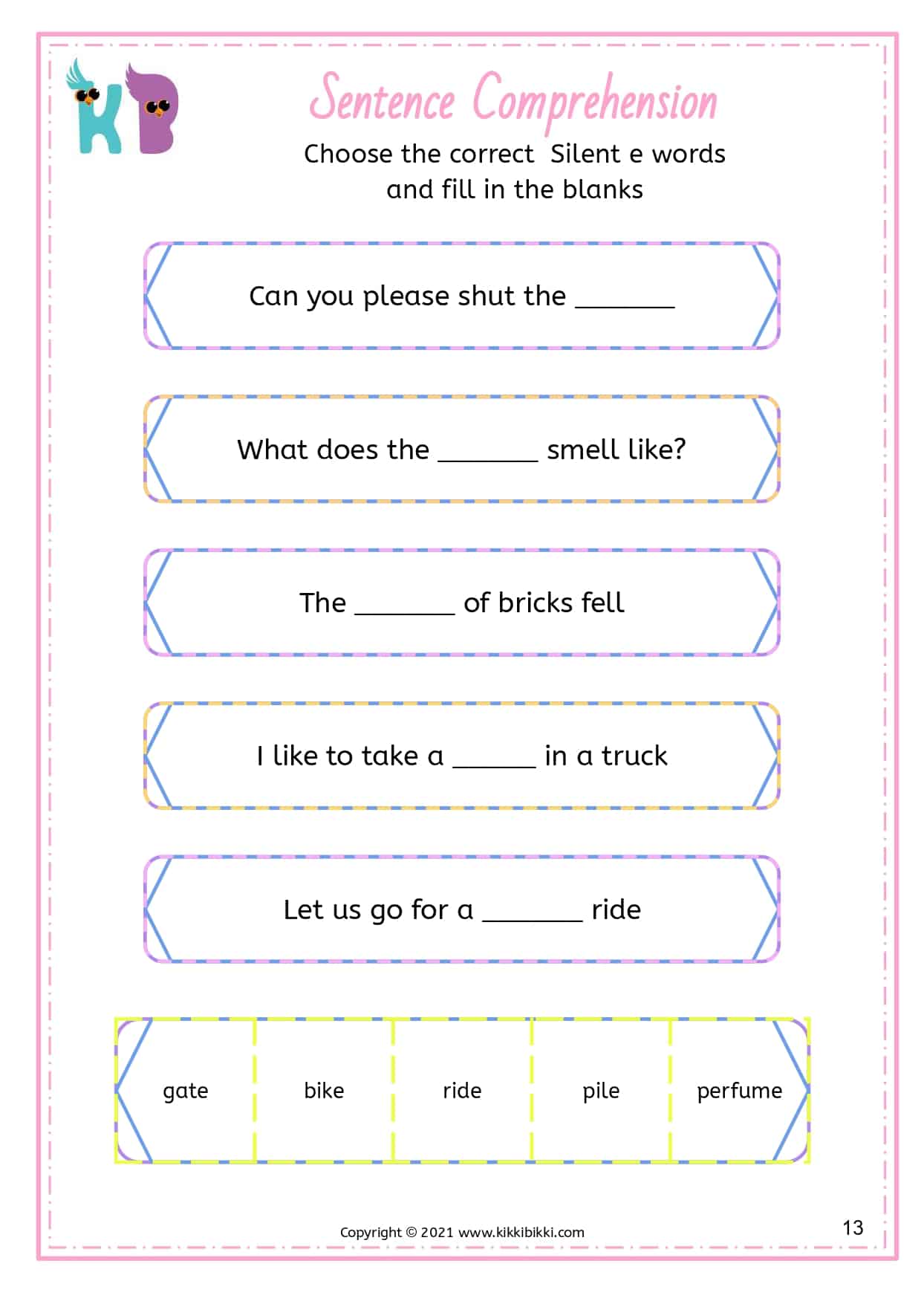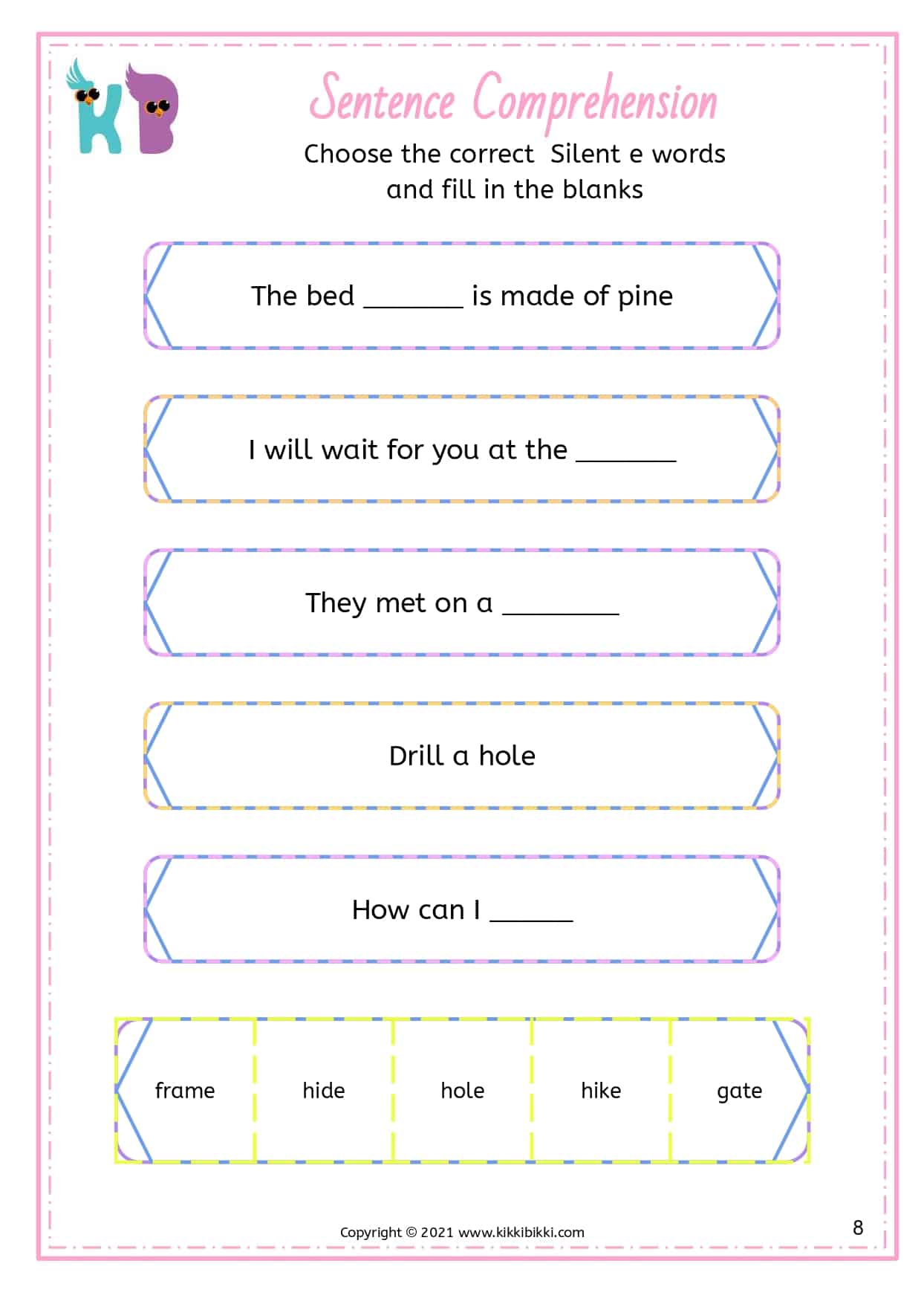 To make the learning experience interactive and enjoyable, our worksheets incorporate various comprehension activities. These activities include answering questions related to the passage, matching silent E words to corresponding images, and completing sentences using the correct silent E word. By actively engaging with the content, kindergarteners develop critical thinking skills, enhance word recognition, and reinforce their understanding of silent E words.