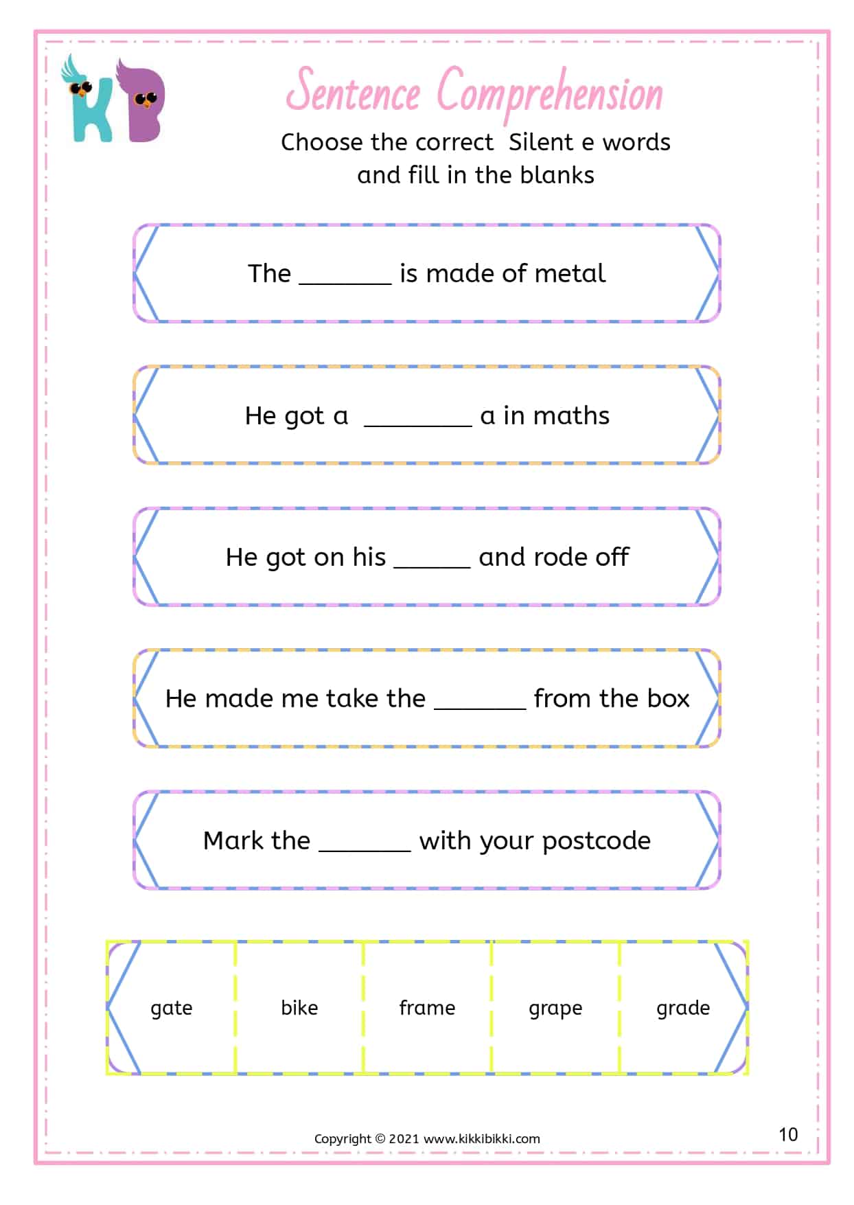 Our collection of free simple comprehension worksheets is designed to strengthen vocabulary skills by focusing on silent E words. Each worksheet presents a short passage or sentence containing silent E words. Children are encouraged to read the text, identify the silent E words, and comprehend the meaning within the context. These worksheets serve as valuable tools for improving reading comprehension while expanding silent E word vocabulary.