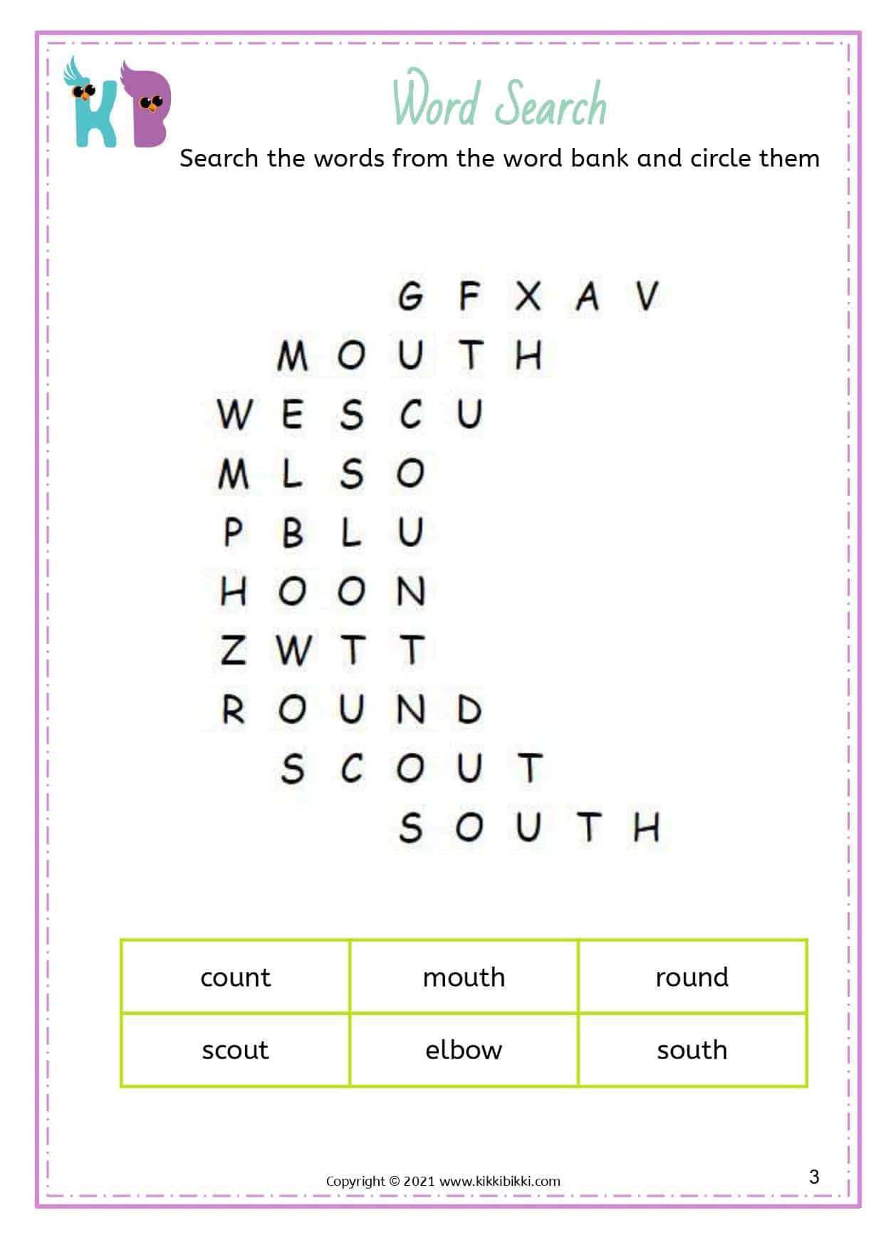 In this exciting worksheet, kindergarten children will embark on a journey to master words containing the “ou” and “ow” sounds. Through interactive word search activities, young learners will enhance their phonemic awareness and strengthen their decoding skills.