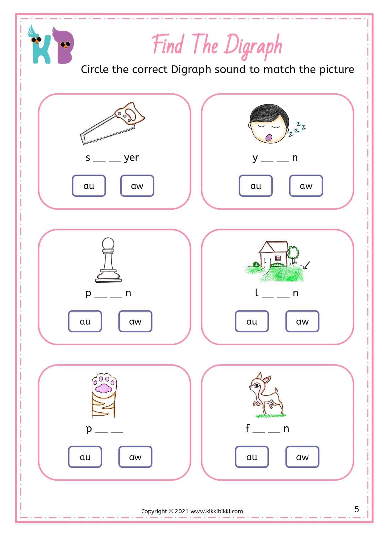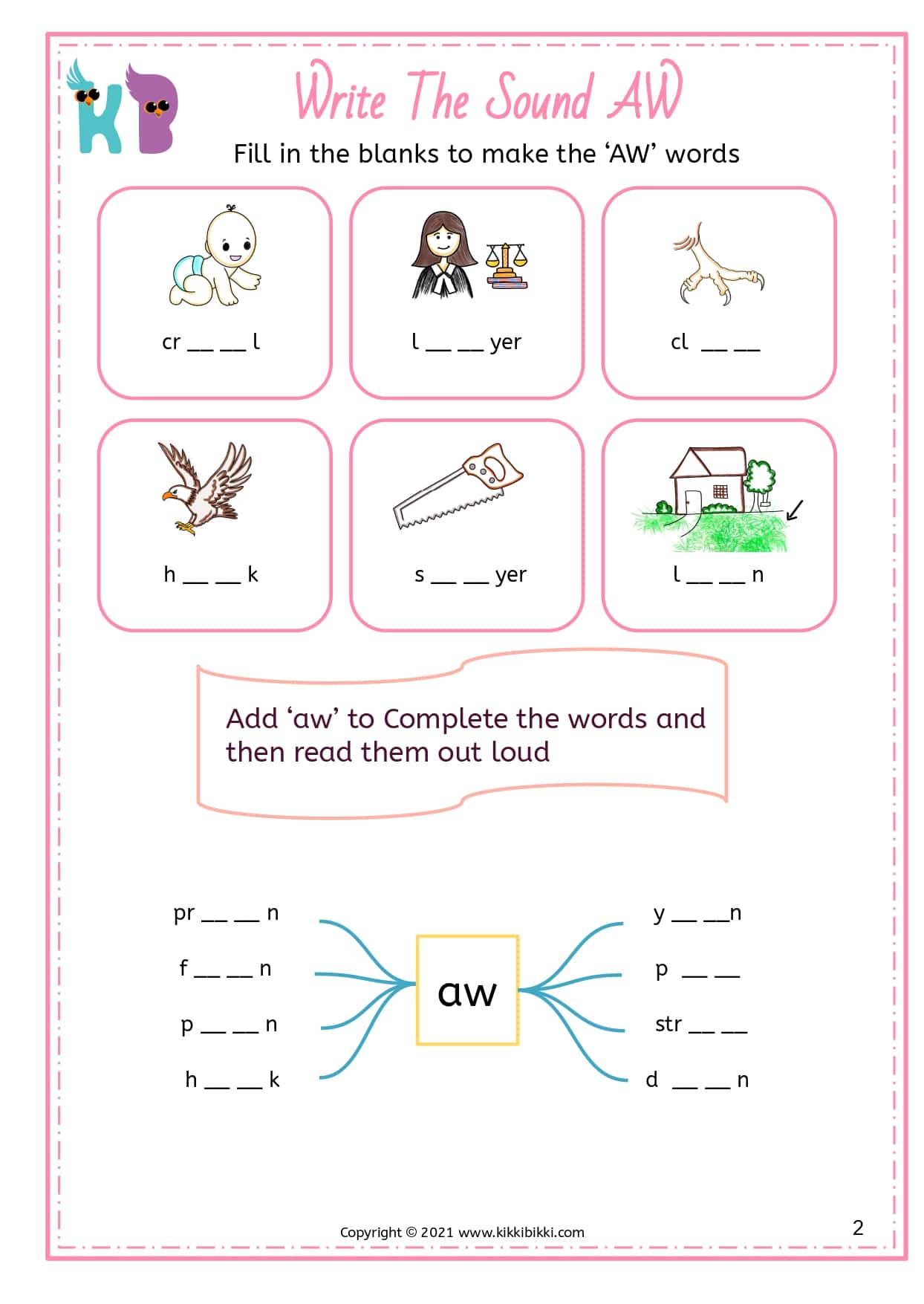 Our free printable worksheet offers an engaging and effective way to introduce the AW digraph and enhance early literacy skills. Through this activity, children can improve their phonemic awareness and develop a deeper understanding of how letters combine to form sounds in words.
